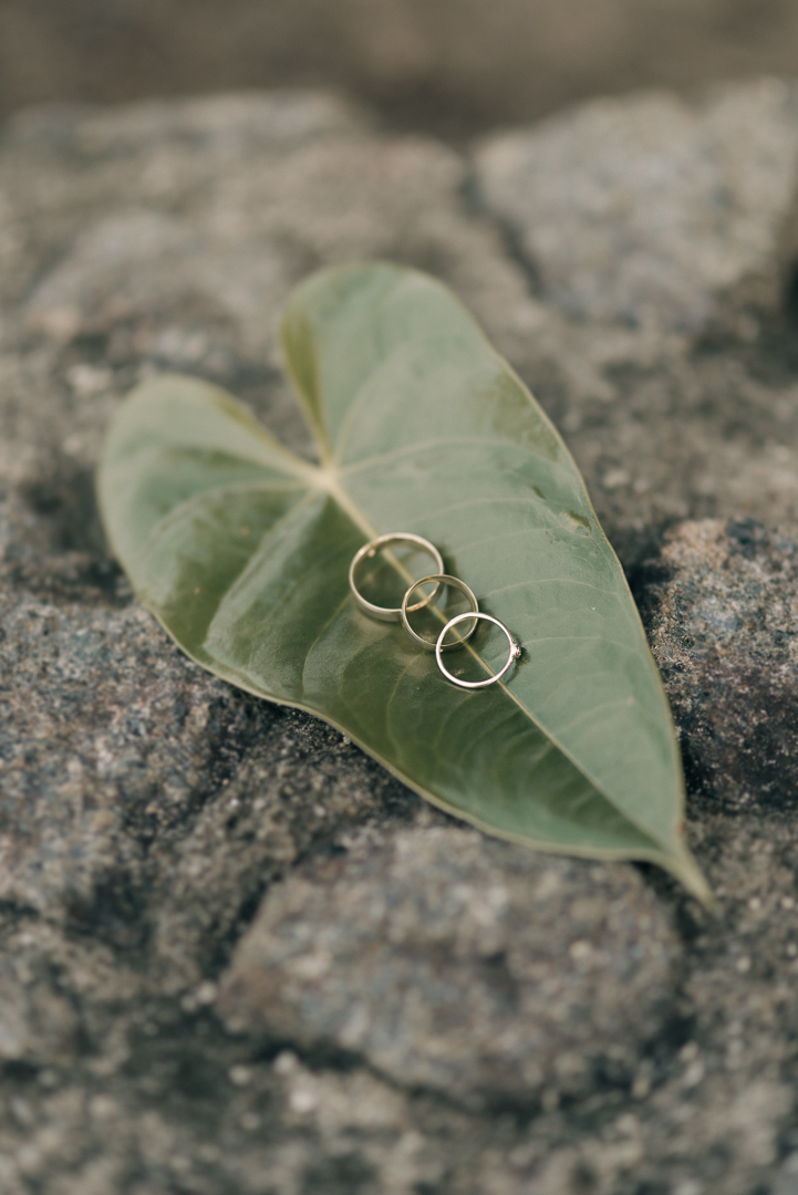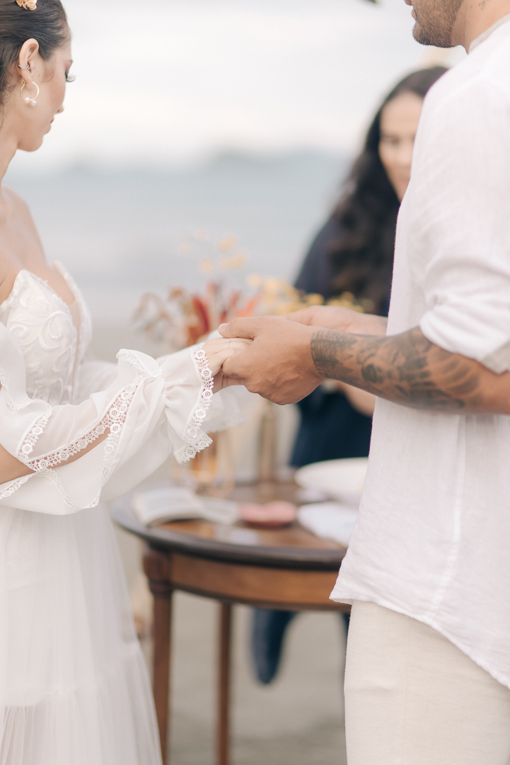 Logo após trocarem alianças, as mãos dos noivos foram banhadas pelas águas do mar que saíam de uma concha, como forma especial de bênção, fortalecendo o vínculo com o oceano e potencializando a singularidade da cerimônia.