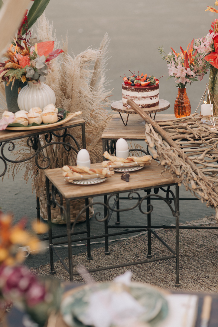 “Para chegarmos ao conceito final do Editorial, fizemos uma longa pesquisa por Instagrams e blogs gringos especializados em casamentos e chegamos numa inspiração de montagem de uma cabana com as comidinhas sendo servidos num estilo de piquenique.”