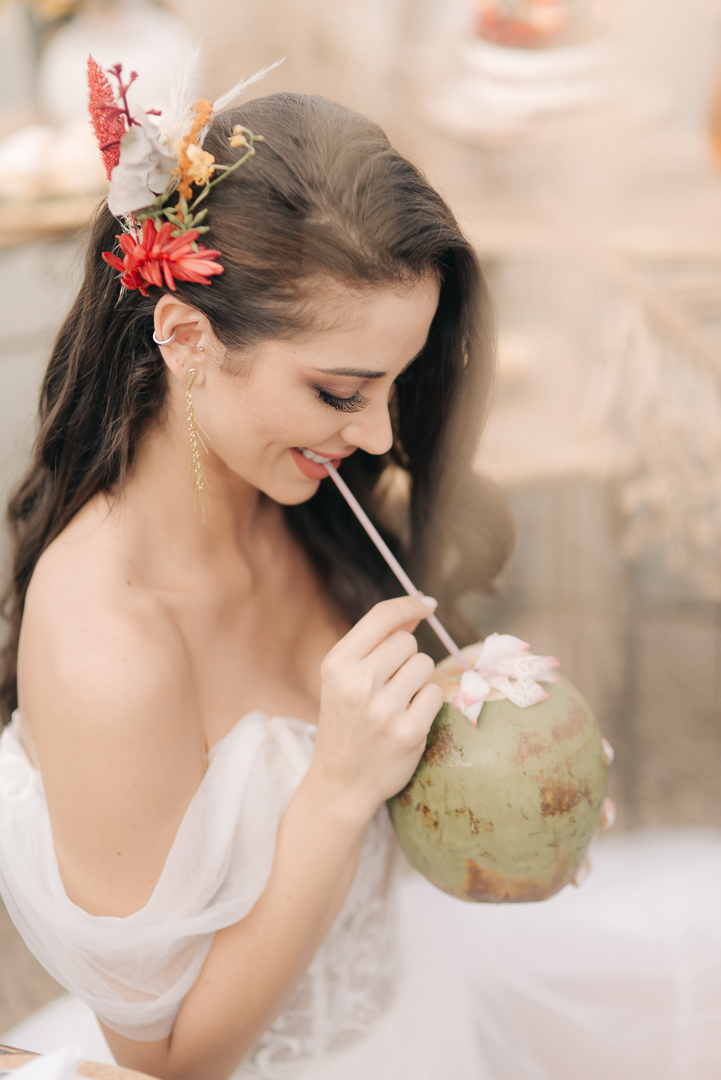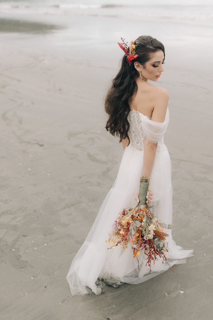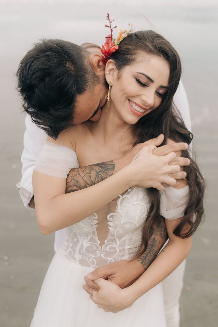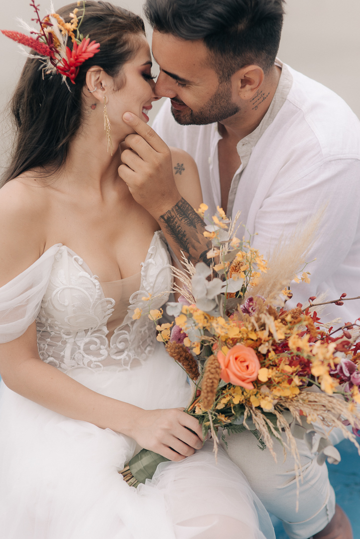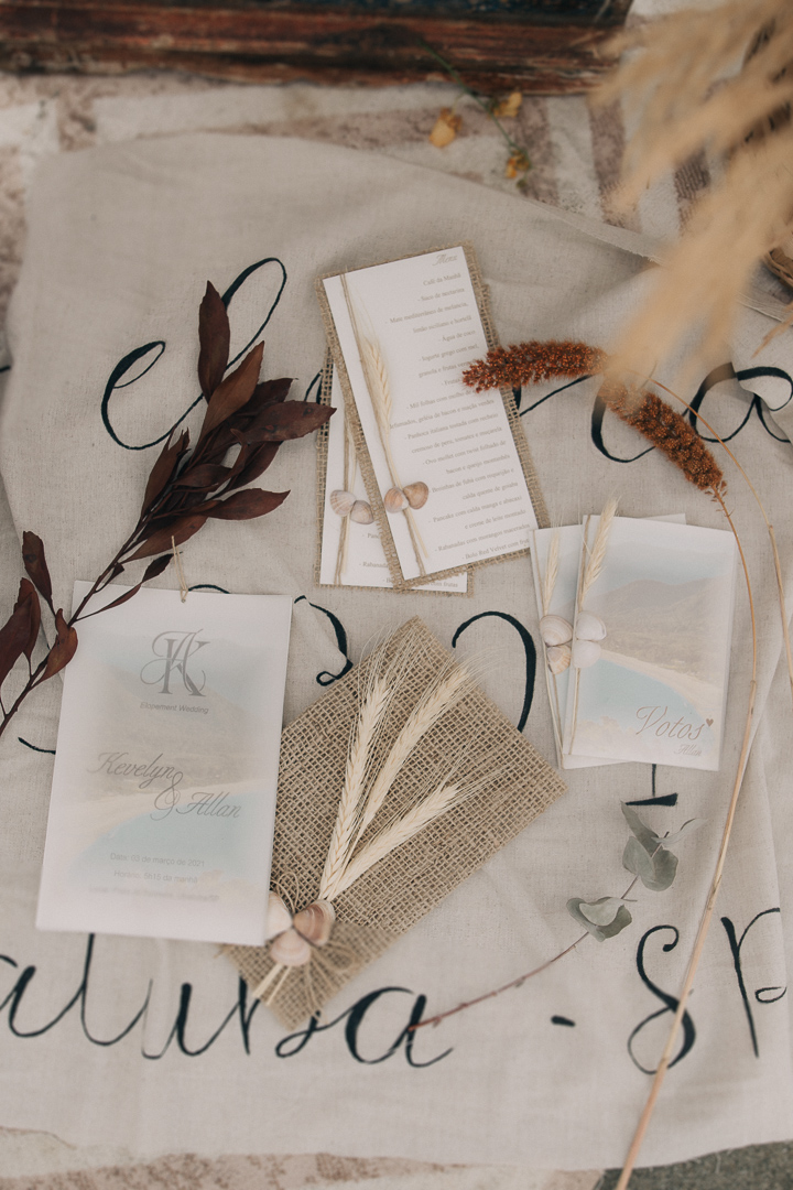 Fazer um elopement wedding ao nascer do sol com um brunch leve foi o conceito escolhido para o Editorial Mar & Amar. A ideia inicial era iniciarmos às 5h30 da manhã quando estivesse ainda um pouco escuro, porém tivemos um contratempo, choveu e conseguimos iniciar os trabalhos a partir das 6h30 da manhã quando o dia já estava claro, finalizando tudo às 10h30.”