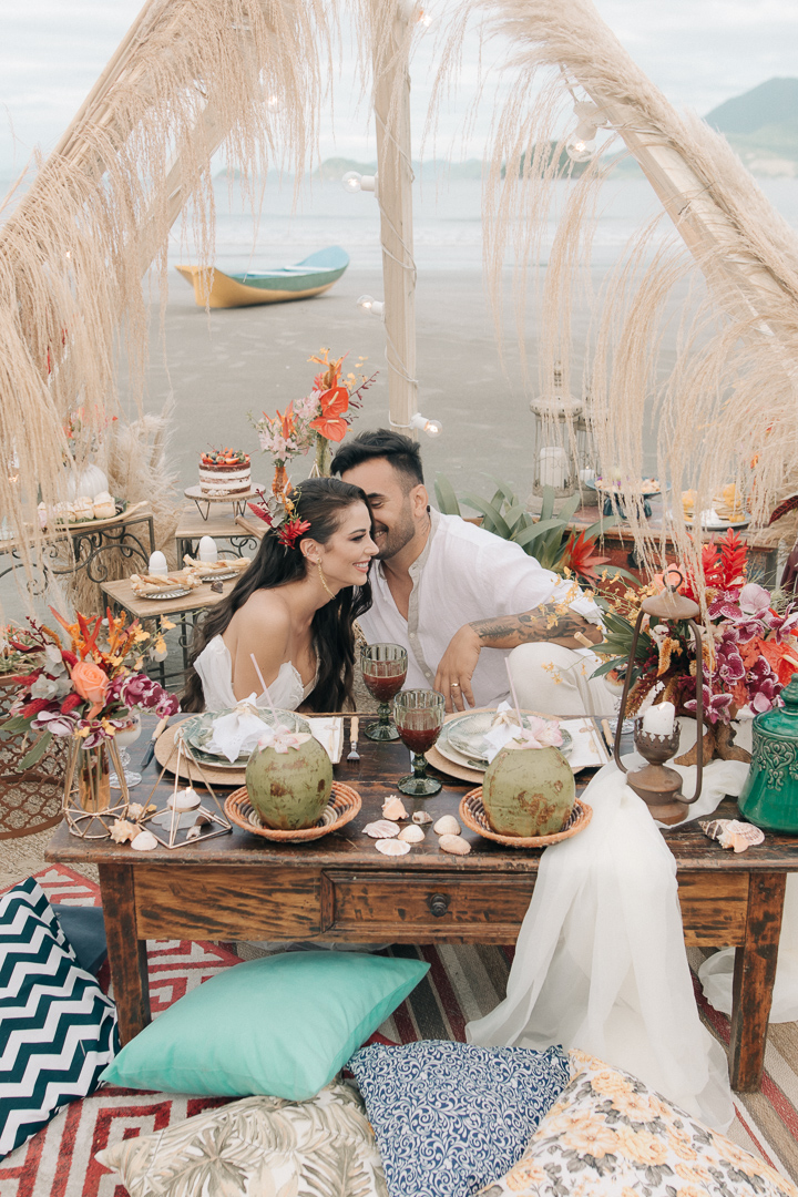 “A nossa ideia para o Editorial foi proporcionar um cenário acolhedor e intimista para que o casal pudesse vivenciar esta experiência a dois num ambiente de praia, com os pés na areia, ao som das ondas do mar e cercados de uma bela paisagem de forma a se sentirem parte daquele ambiente e nada mais importar do que o AMOR existente entre os dois.”