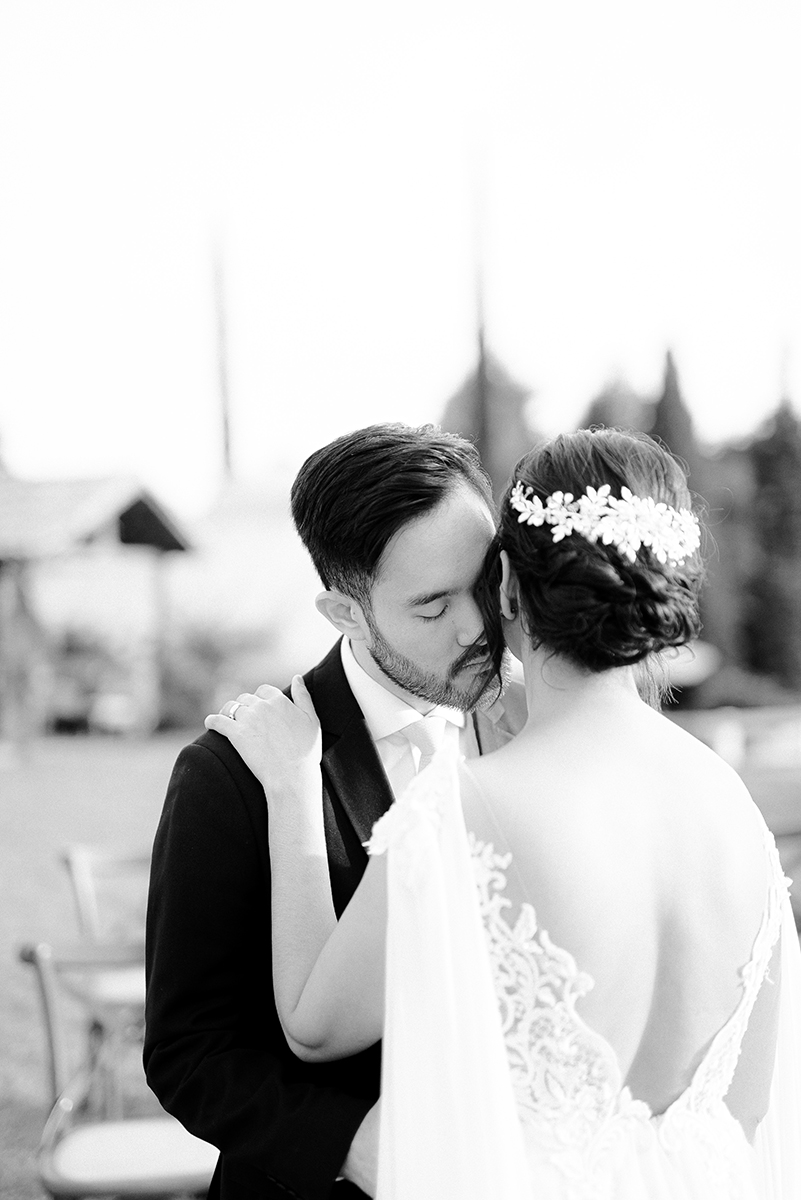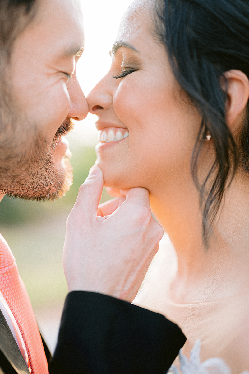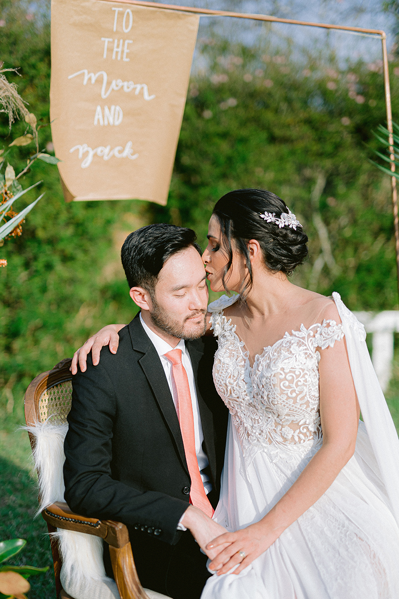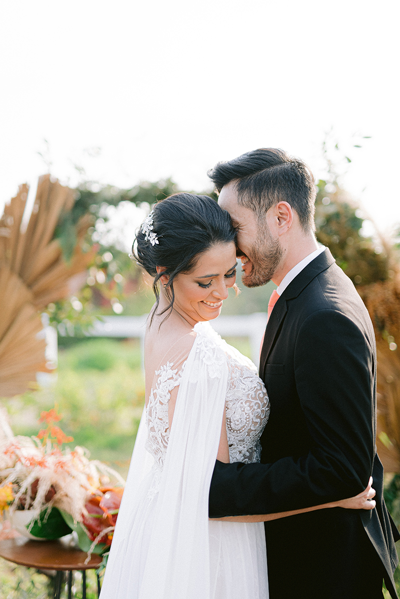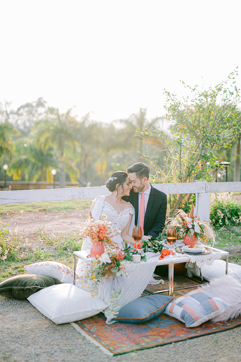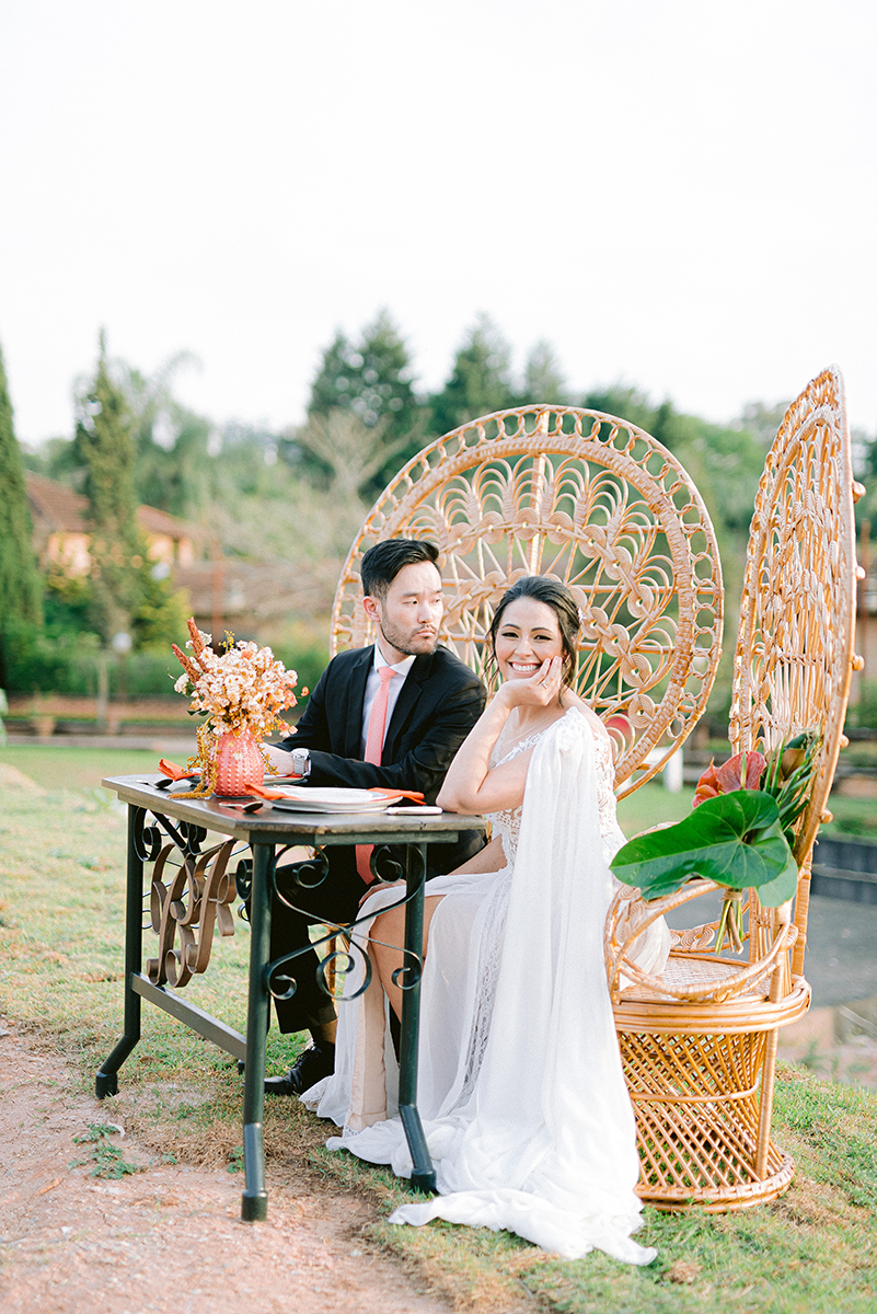 Fizeram o editorial ao entardecer porque precisavam da luz do pôr do sol quente para deixar a atmosfera ainda mais romântica. A cartela de cores da decoração assinada pela Roberta Gouvea estava recheada de flores rosadas e alaranjadas. Essas cores misturadas com o look branco da noiva e o preto predominante do noivo aproxima e traz a sensação de estar mais perto do que eles estão sentindo. As cores dizem muito sobre um casal, um projeto ou uma história. Elas são tão importantes quando o porque de tudo isso.