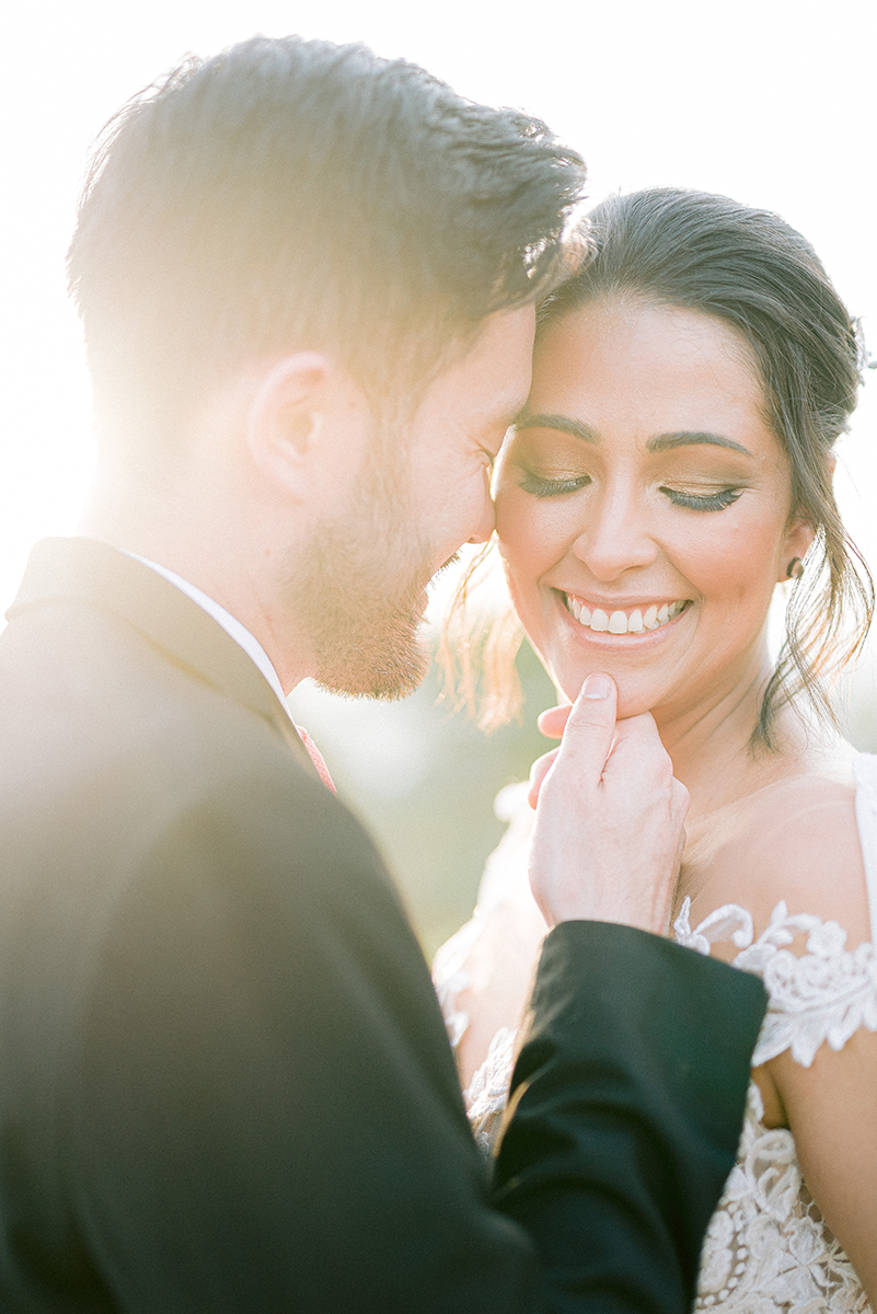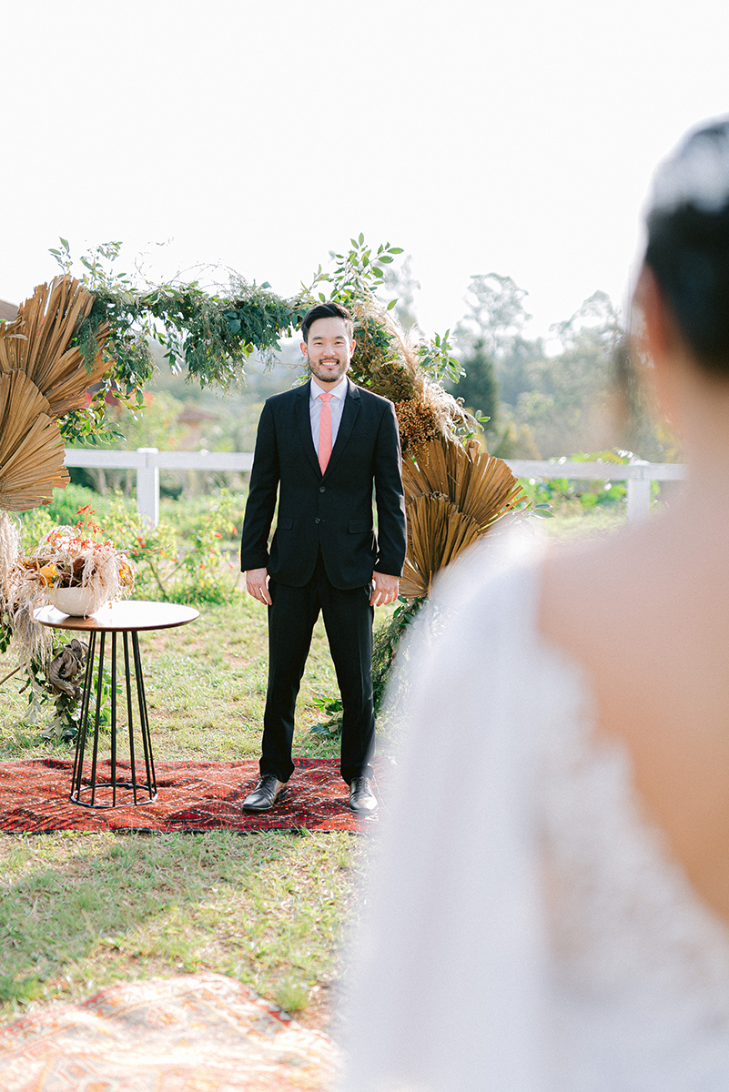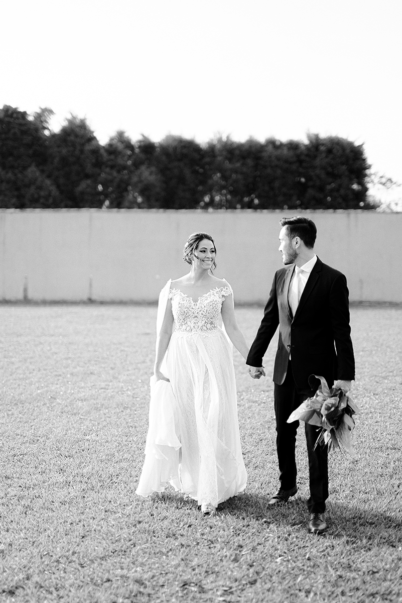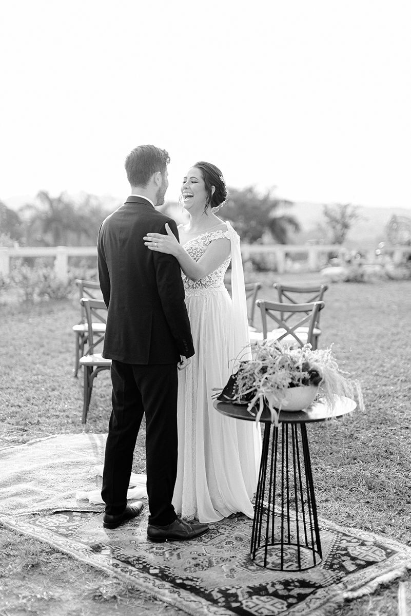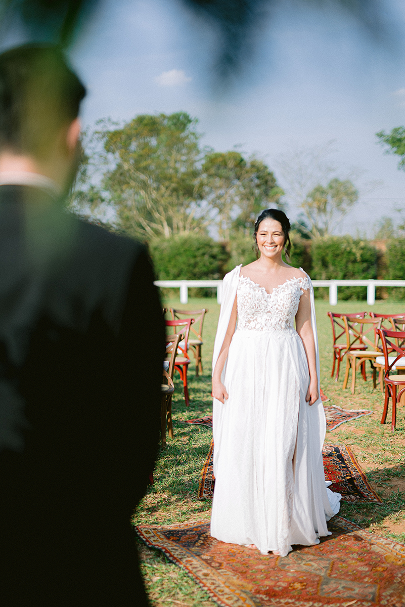 “Amamos a vibe de casamento no campo e mentalizamos o fato de fazer as fotos no haras Buona Fortuna. Tínhamos o desejo de fazer uma cerimônia em modo circular e alí no jardim completamente verde, onde ainda não aconteceu nenhum cerimônia. Preparamos uma cerimônia clássica com as cadeiras em linha reta para o altar e depois modulamos para o modo circular onde os noivos final no meio. Acho muito interessante, parece que estão em uma roda de amigos e a sensação é de que os noivos estão sendo abraçados por todos.” Nas fotos isso fica muito legal porque permite dar um giro completo e sempre ter a reação de alguém, e conseguiram vários tipos de luz.
