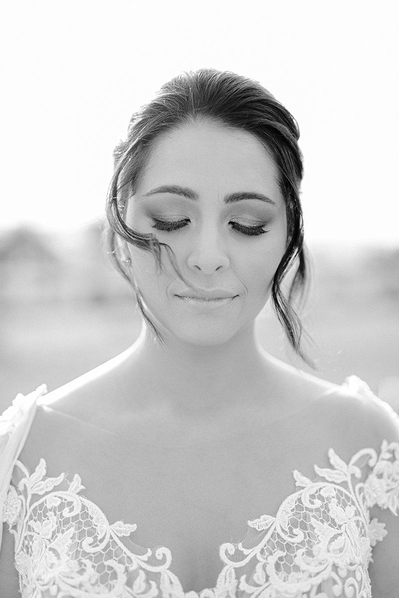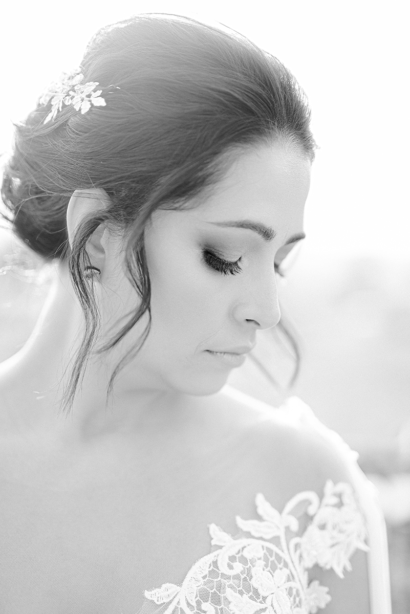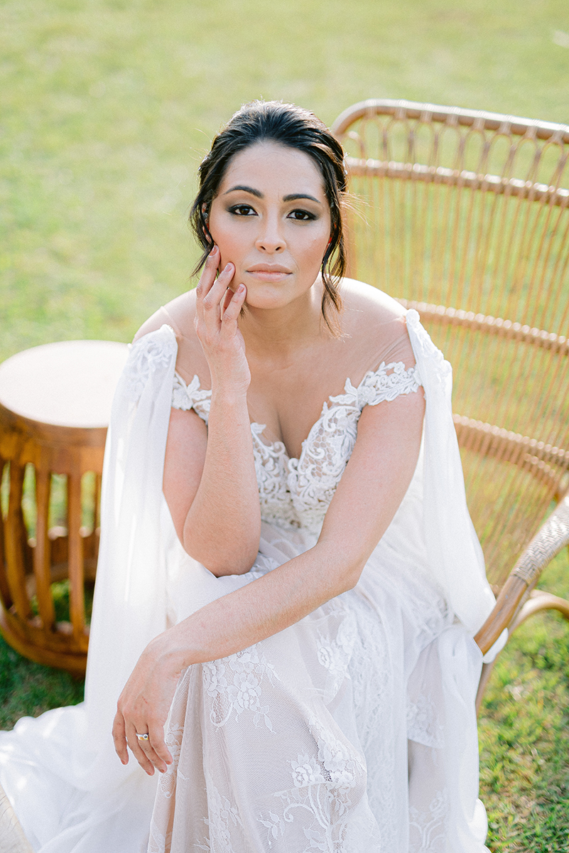 Para o vestido de noiva, a NatKat Bridal pensou em um modelo bem veranil, confortável e fresquinho. Para finalizar o look informal e com carrinha de campo, a Gisele Barbosa fez uma maquiagem natural e um chignon baixo com fios soltos para dar movimento.