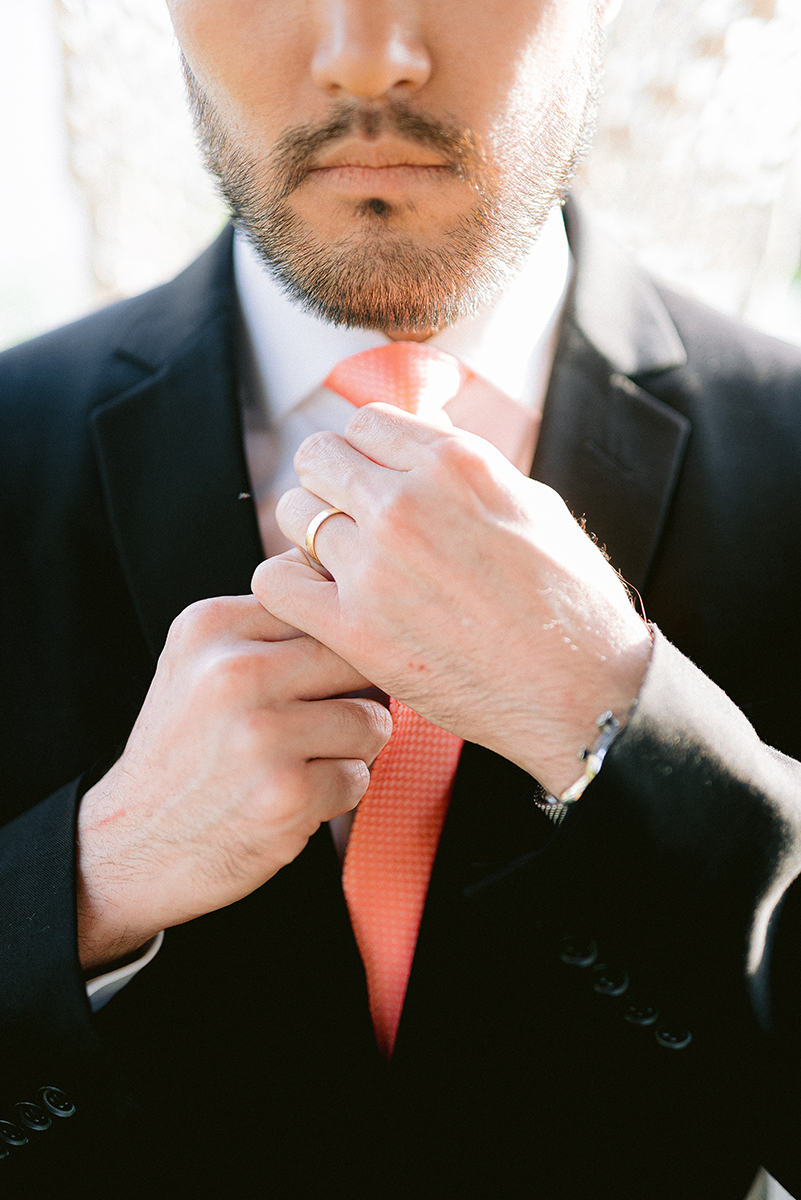 O Marcelo veste um look básico preto e branco com o detalhe da gravata rosa. Um homem pode ser uma pessoa extremamente básica, mas um toque de cor faz ele ser parte integral do dia mais importante da vida dele sendo quem ele é. E aqui mais uma vez mostra a importância do trabalho das cores em um casamento.