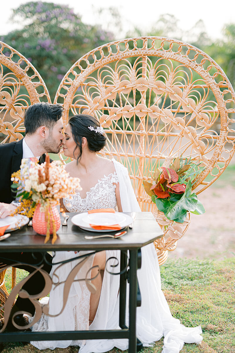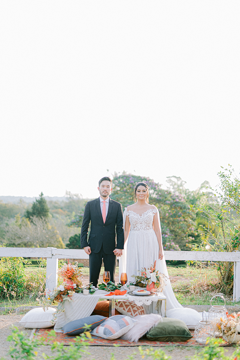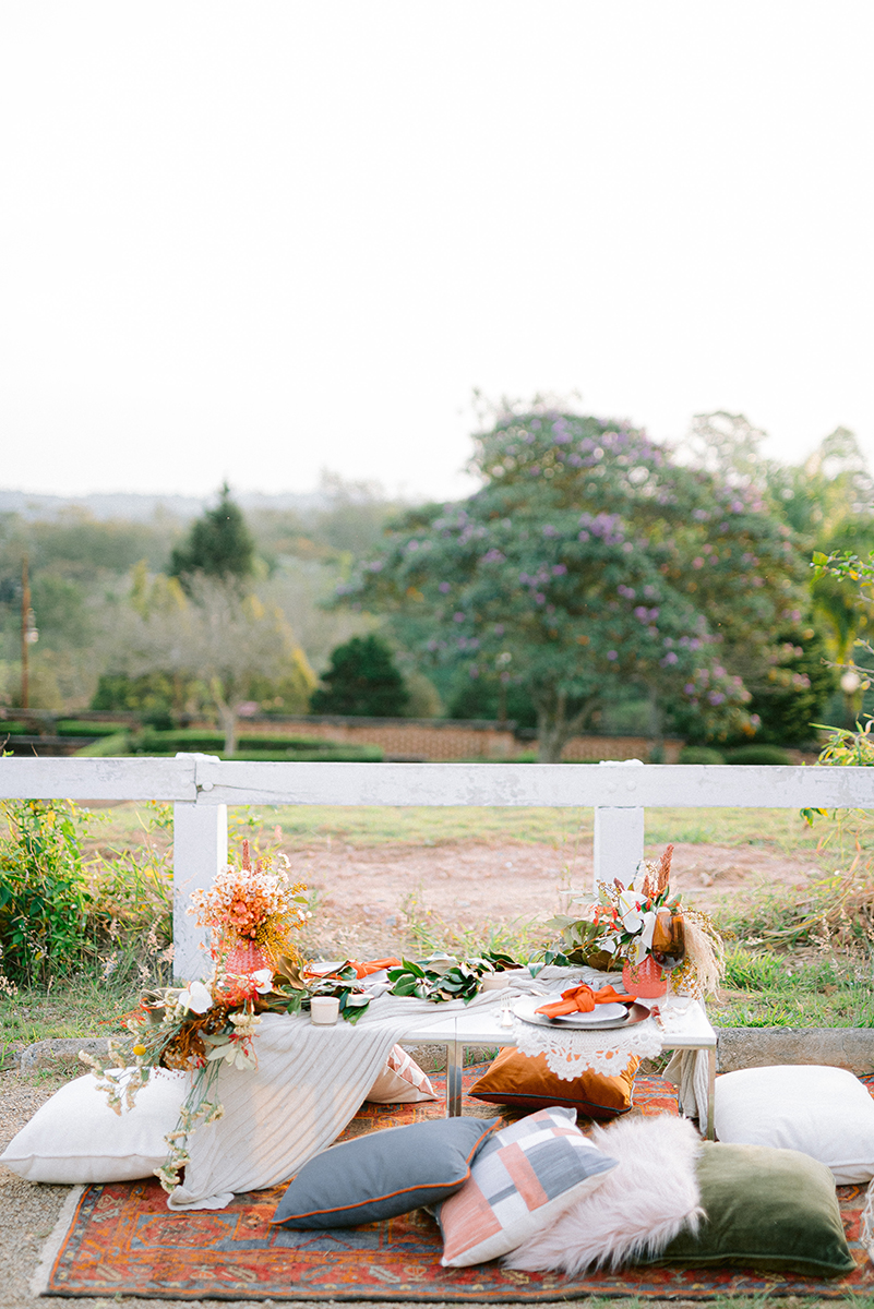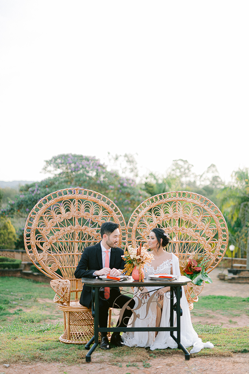 A mesa para os noivos, com as gostosuras da Arquitetando Paladar, recebeu duas propostas diferentes. A cadeira pavão com toda elegância e potência que uma fazenda com haras traz. E outra mesa ao estilo indie, com os noivos sentados ao chão. Esse aconchego todo dá vontade de ficar alí pra sempre. As cores das flores quentes trazem ainda mais sensação de romantismo e aproxima não só o casal nas fotos mas o espectador da cena. E a luz de pôr do sol nem é preciso dizer que fez as fotos se transformarem em cartaz de cinema!