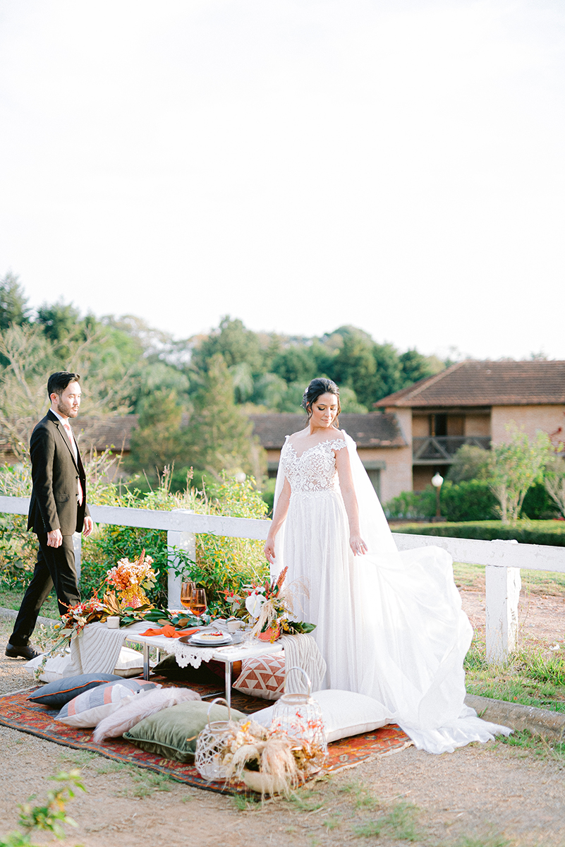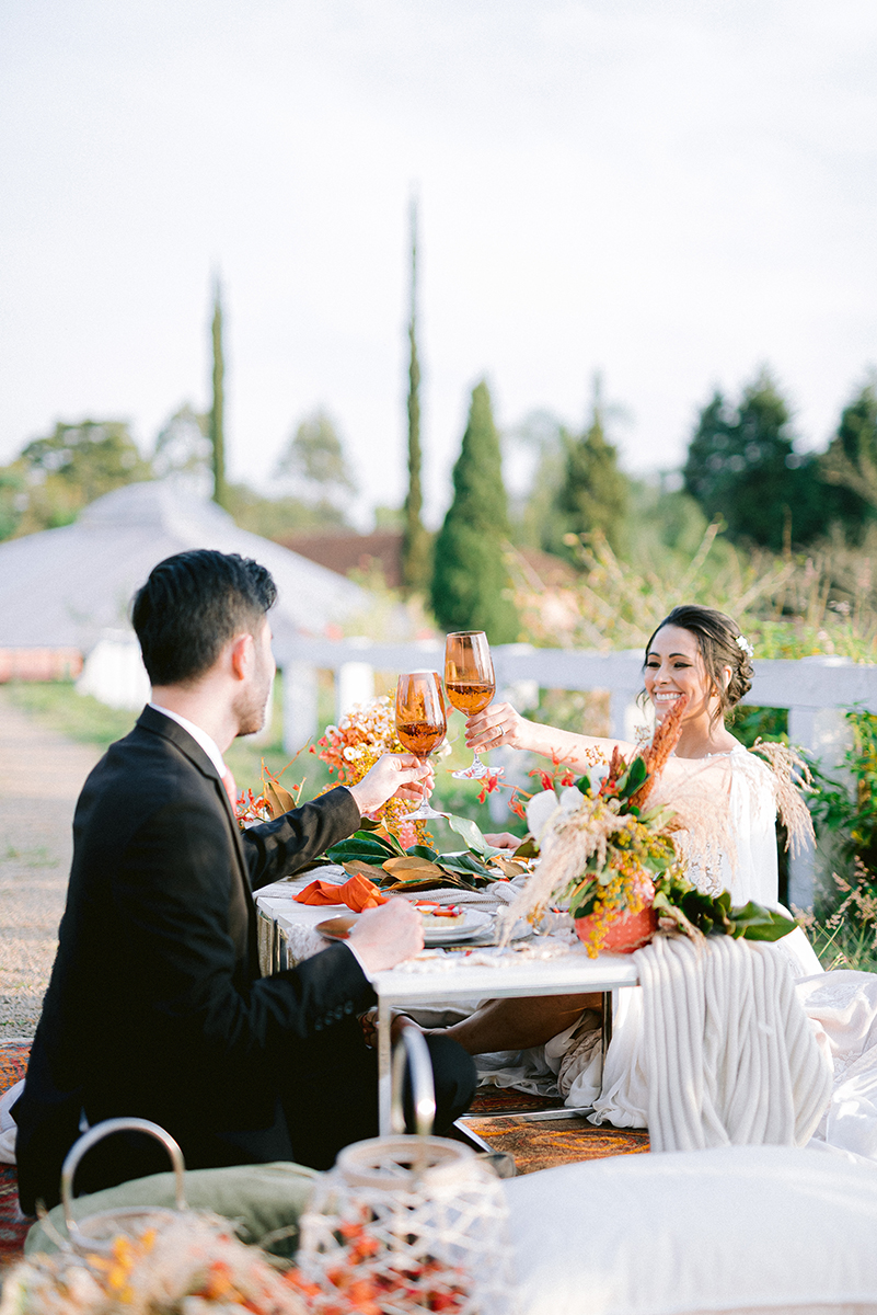 A mesa para os noivos, com as gostosuras da Arquitetando Paladar, recebeu duas propostas diferentes. A cadeira pavão com toda elegância e potência que uma fazenda com haras traz. E outra mesa ao estilo indie, com os noivos sentados ao chão. Esse aconchego todo dá vontade de ficar alí pra sempre. As cores das flores quentes trazem ainda mais sensação de romantismo e aproxima não só o casal nas fotos mas o espectador da cena. E a luz de pôr do sol nem é preciso dizer que fez as fotos se transformarem em cartaz de cinema!