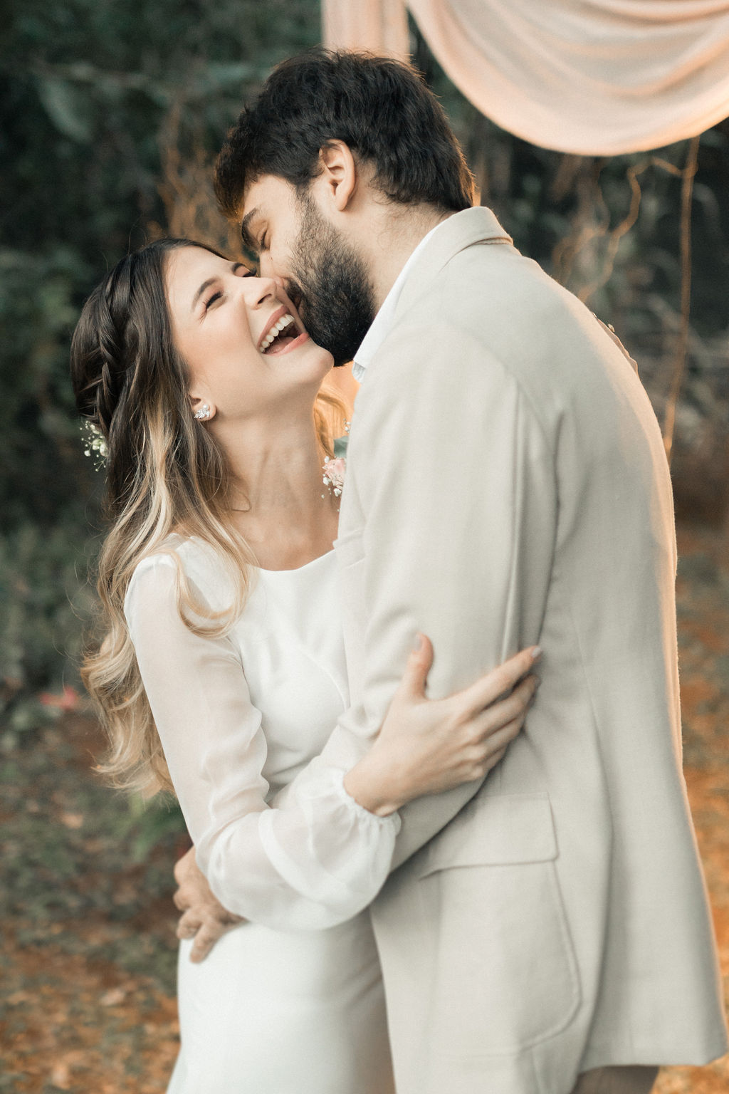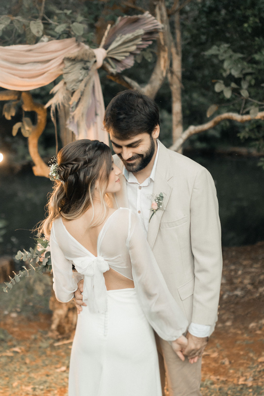 A noiva é super delicada e romântica. O vestido foi inspirado em sua personalidade, básica, natural e cheia de delicadeza. O noivo seguiu essa mesma linha, prevalecendo a tonalidade clara que remete a esse conceito.
