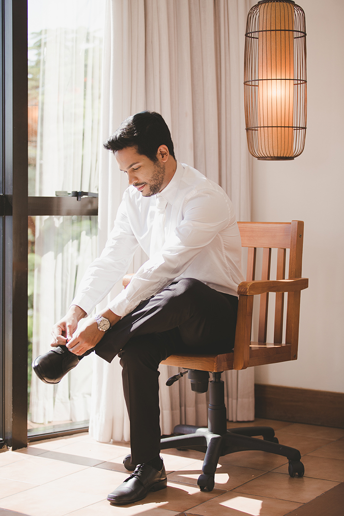 “Usamos a referência do filme “Espelho, Espelho Meu”, com Lily Collins, para transformar este noivo em uma pessoa moderna e clássica ao mesmo tempo, com calça e colete pretos, blusa e gravatas brancas.” Ficou essa pegada clássica moderna para o look do noivo.