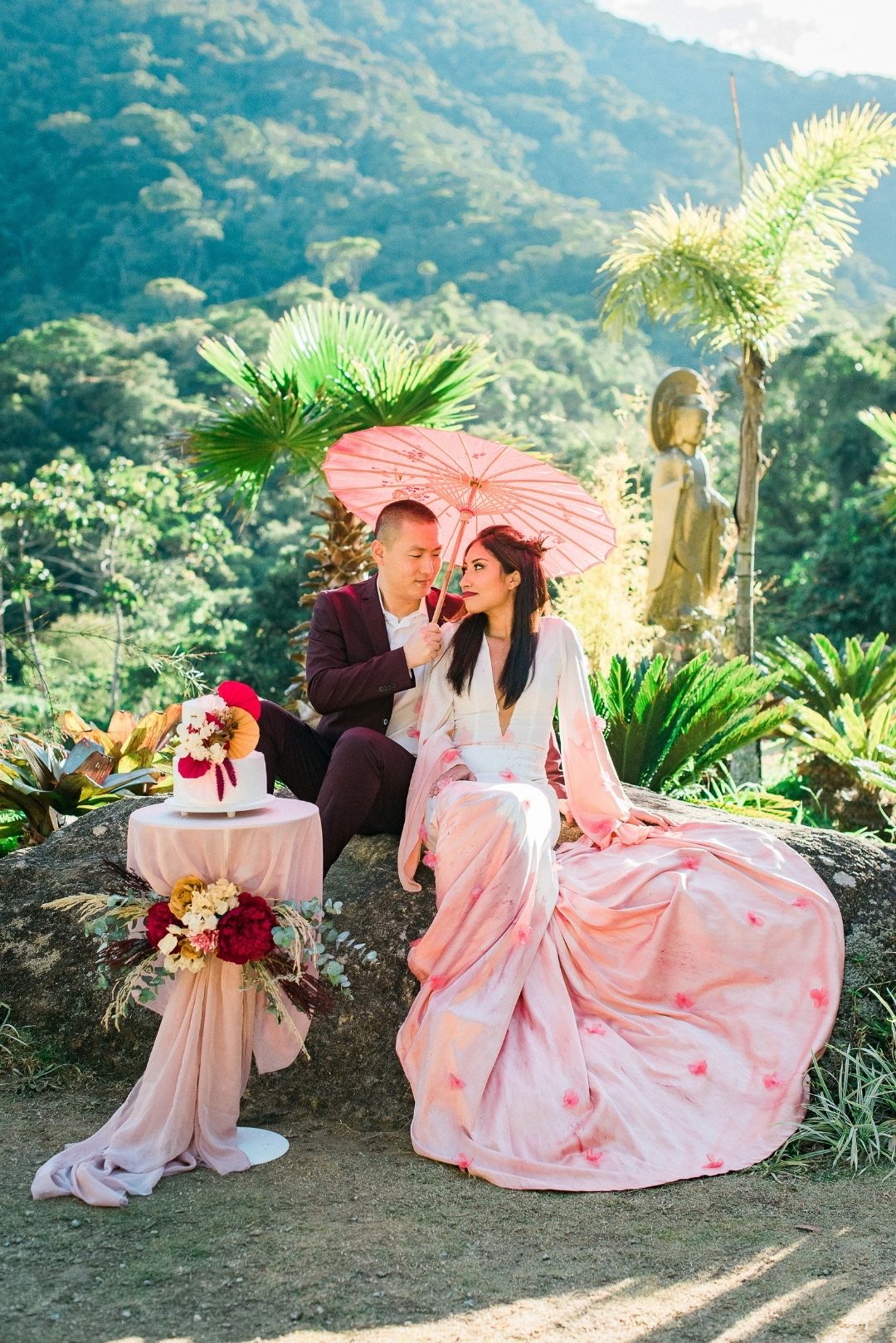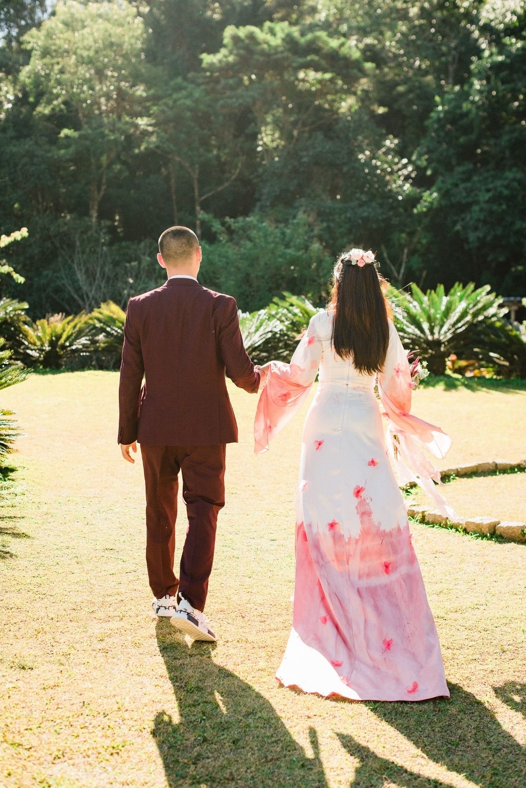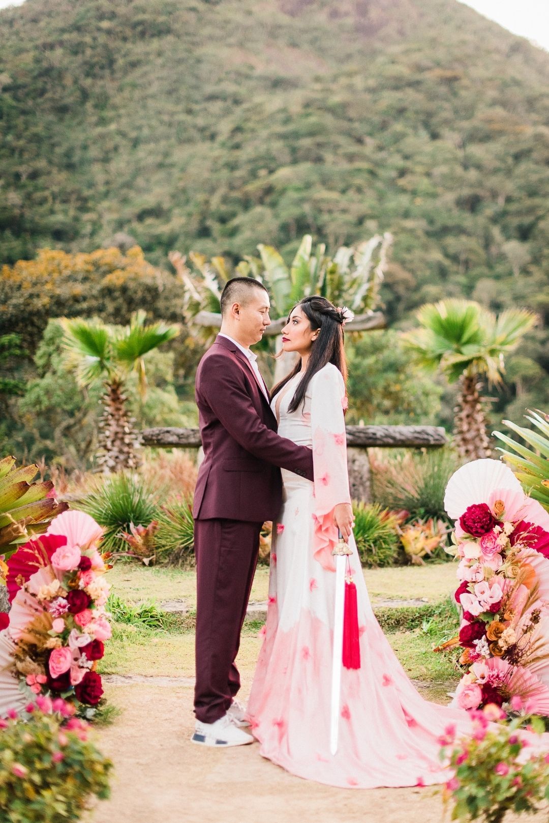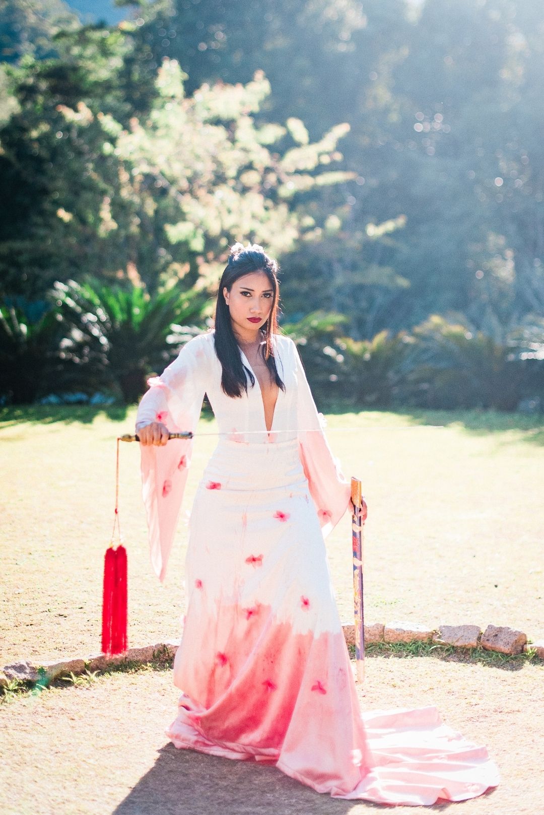 Para incorporar e mostrar um novo olhar sobre a heroína, o Atelier Marcella Abdalla criou um vestido inspirado no modelo da animação, na hora em que Mulan canta a música com o nome do editorial, “Reflection”. É tradição usar vermelho em casamento chineses, por isso a barra tingida. O casal do editorial é chinês. “Fizemos questão que fossem e que nos ensinassem mais sobre a cultura deles no dia do casamento, e seguimos todas as dicas para não ter nenhum erro.”