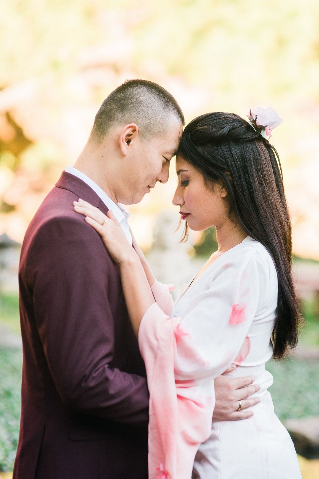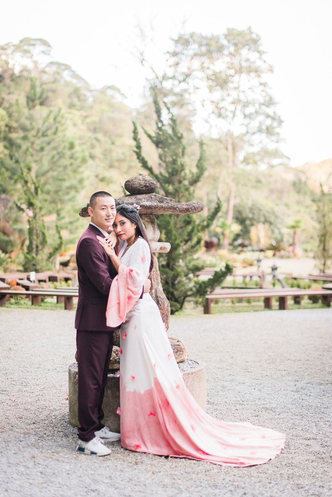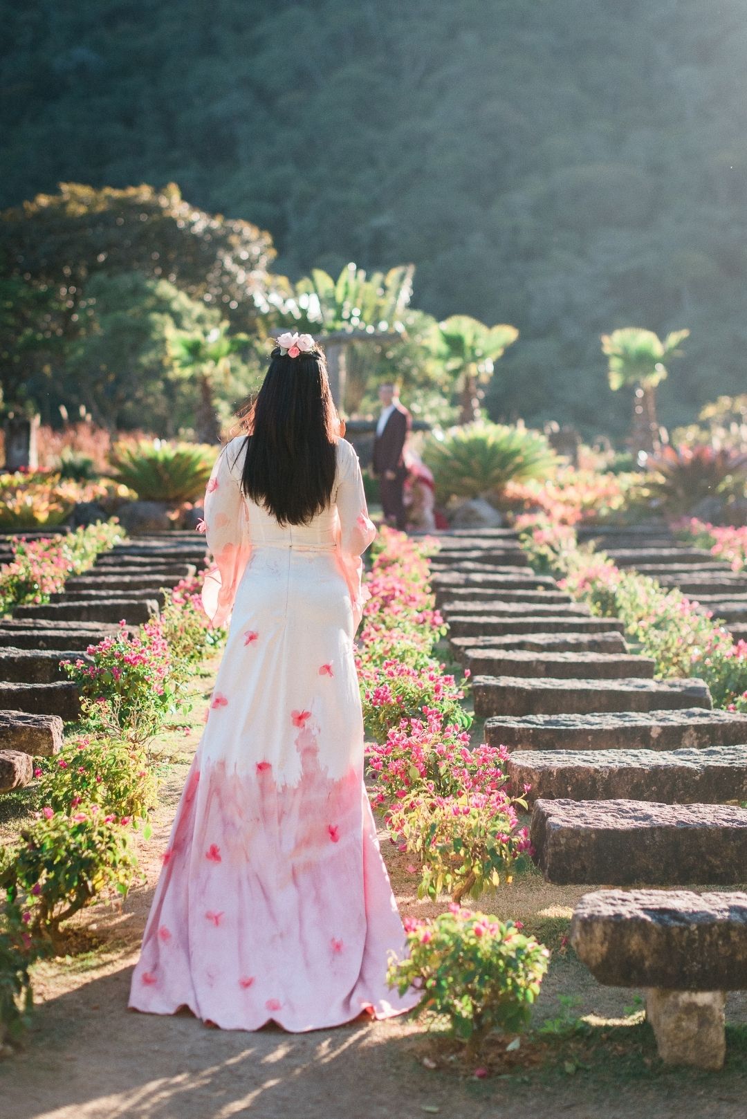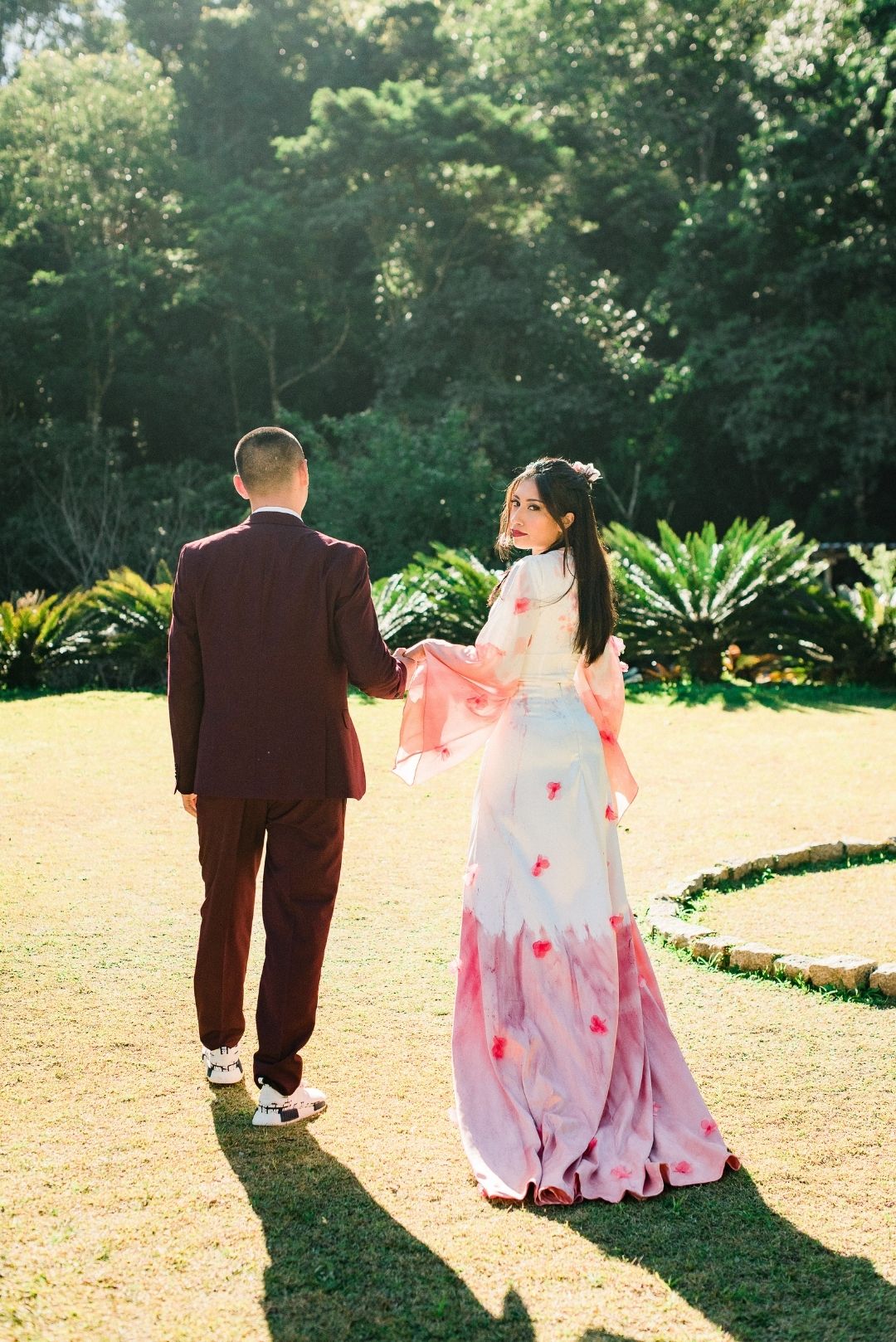 Para incorporar e mostrar um novo olhar sobre a heroína, o Atelier Marcella Abdalla criou um vestido inspirado no modelo da animação, na hora em que Mulan canta a música com o nome do editorial, “Reflection”. É tradição usar vermelho em casamento chineses, por isso a barra tingida. O casal do editorial é chinês. “Fizemos questão que fossem e que nos ensinassem mais sobre a cultura deles no dia do casamento, e seguimos todas as dicas para não ter nenhum erro.”
