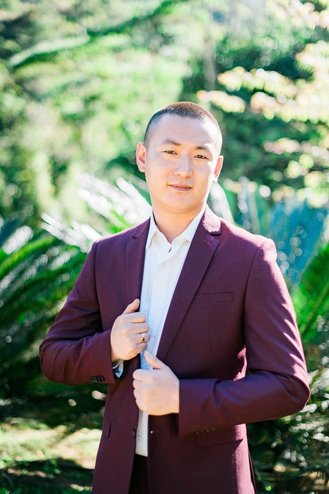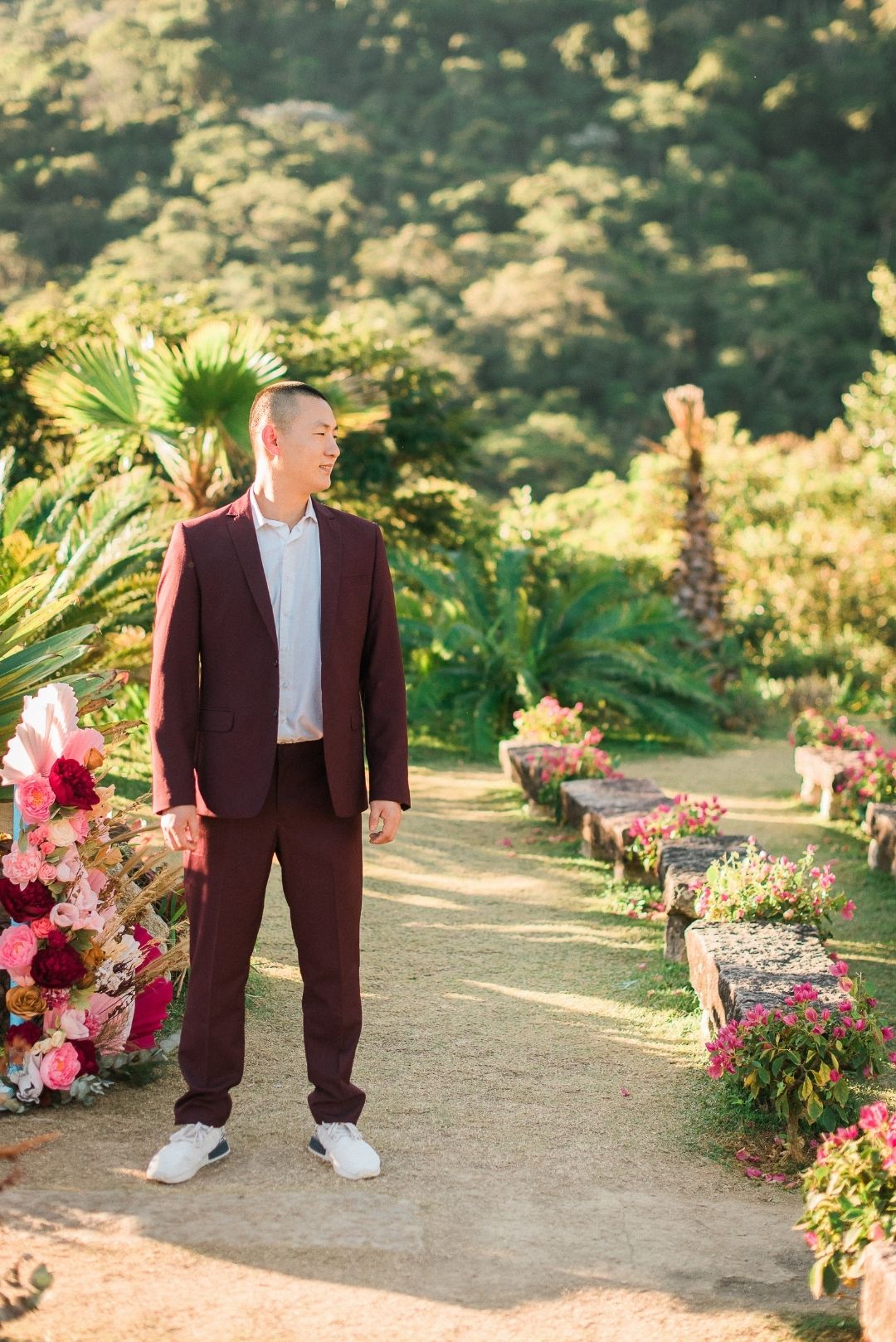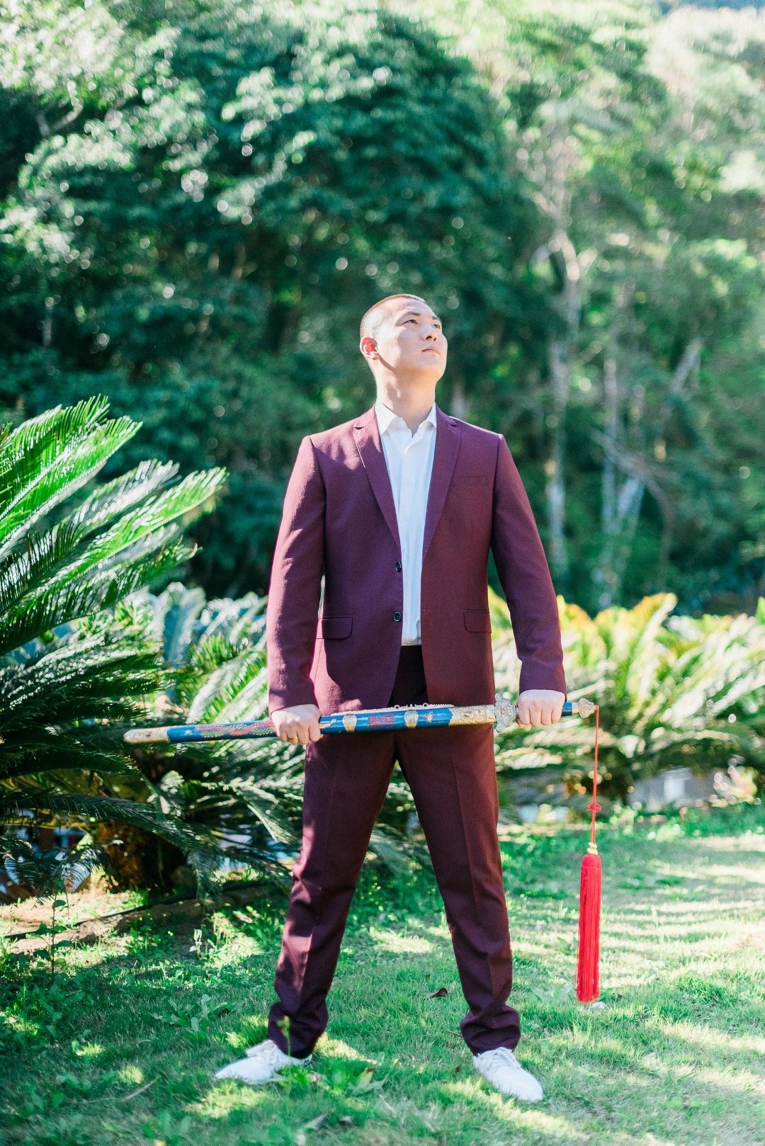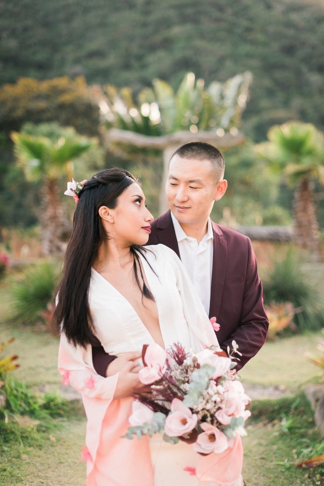 Já para o traje masculino a cor pensada foi o marsala, que tem um tom de vermelho mais suave e inspirar os noivos a usar cores no casamento.
