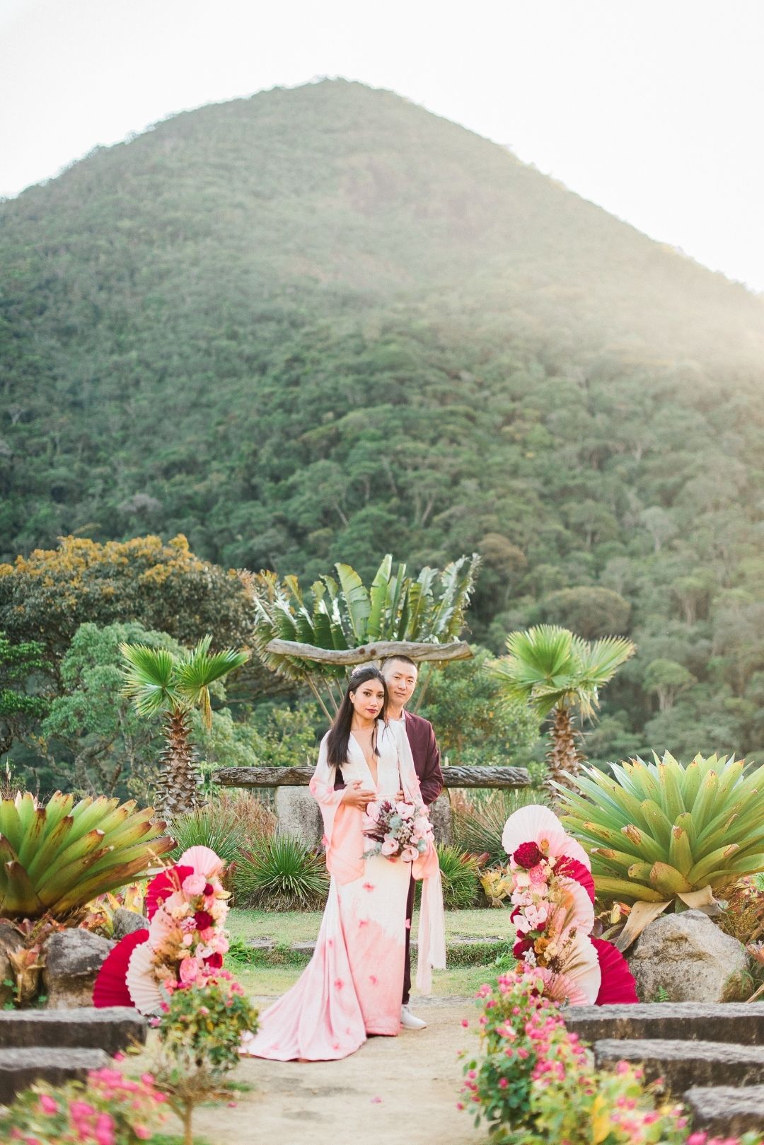 O buquê, composto essencialmente de magnólias, não podia ser diferente, já que Mulan significa Magnólia. A flor está presente em toda decoração, compondo com as peônias vermelhas uma combinação perfeita. “Pensamos em uma decoração que valorizasse toda a natureza ao redor, que somasse a beleza local, e o resultado ficou surpreendentemente lindo!”