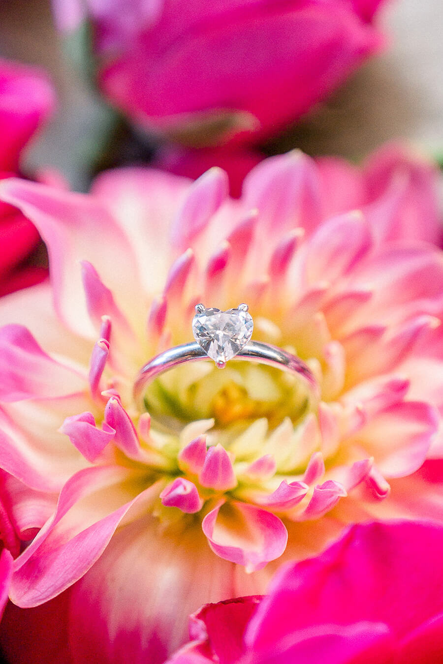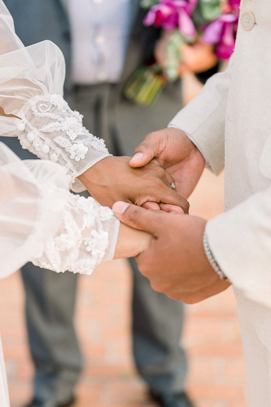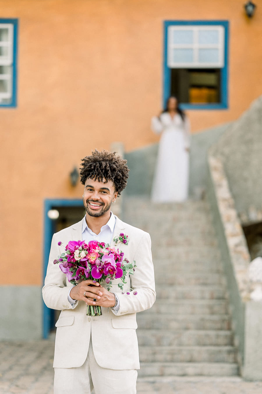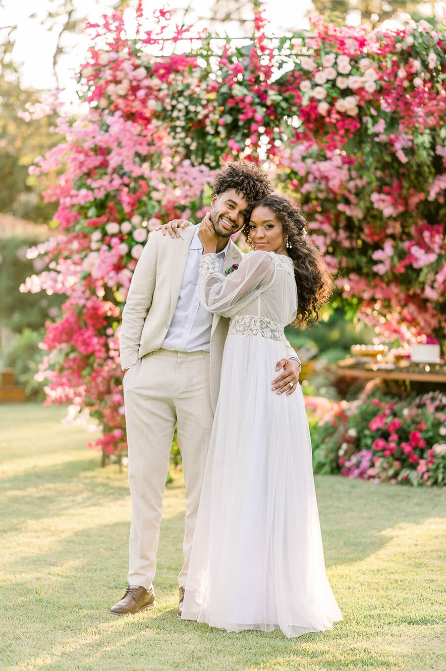 Já ela, usou um vestido fluído de mangas longas e aplicações florais, que juntamente com o penteado semipreso e o solitário com diamante de coração, trouxeram a vibe romântica que o editorial buscava. O buquê foi a cereja do bolo e arrematou o visual da noiva com um toque de Viva Magenta.