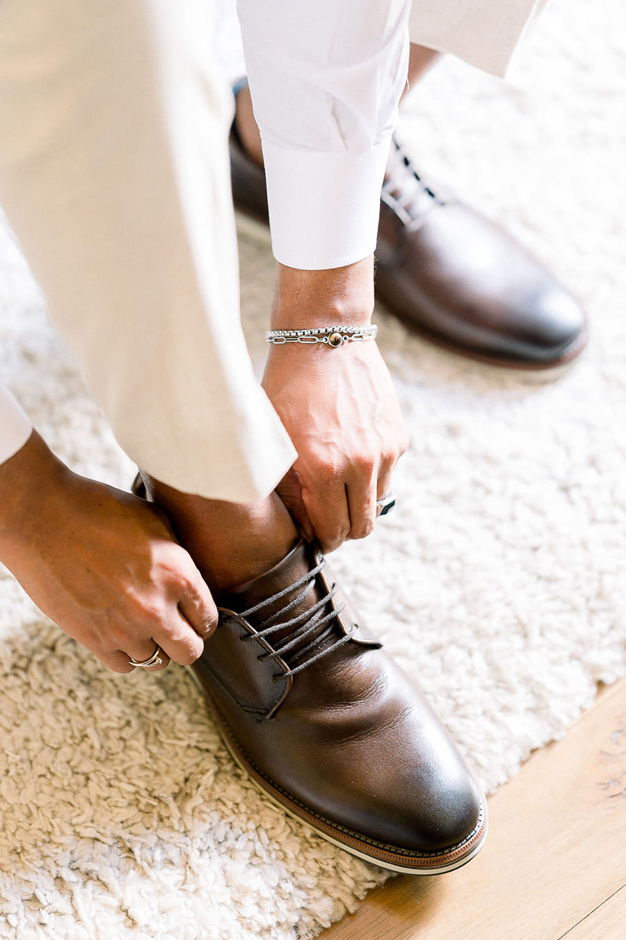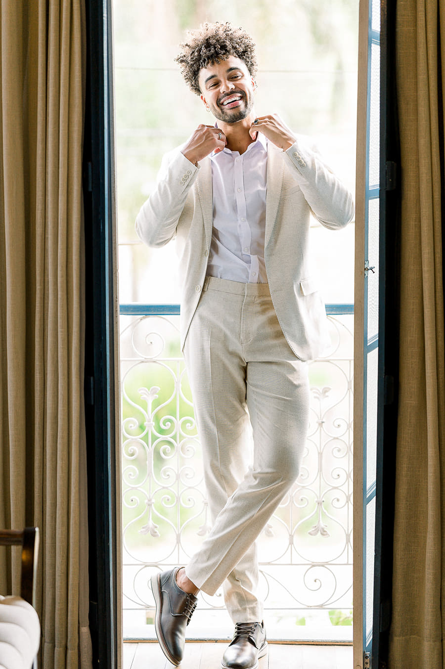 Camila e Caio encontraram um visual perfeito para um casamento diurno em meio à natureza. Ele, apostou em um terno claro sem gravata e sapatos marrons.