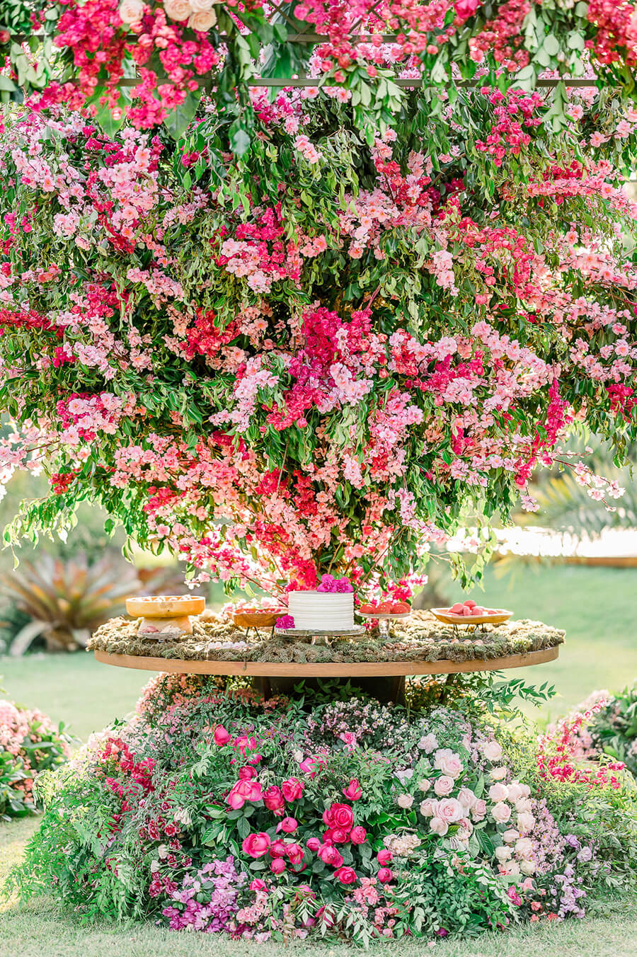 O projeto de decoração assinado pela Núbia Monteiro trouxe também outra grande tendência de 2023: o maximalismo! Estamos de queixo caído com essa mesa de bolo e doces super imponente com arranjos florais impactantes, que reuniram diversas tonalidades de rosa as folhagens e musgo para um efeito bem orgânico e natural.