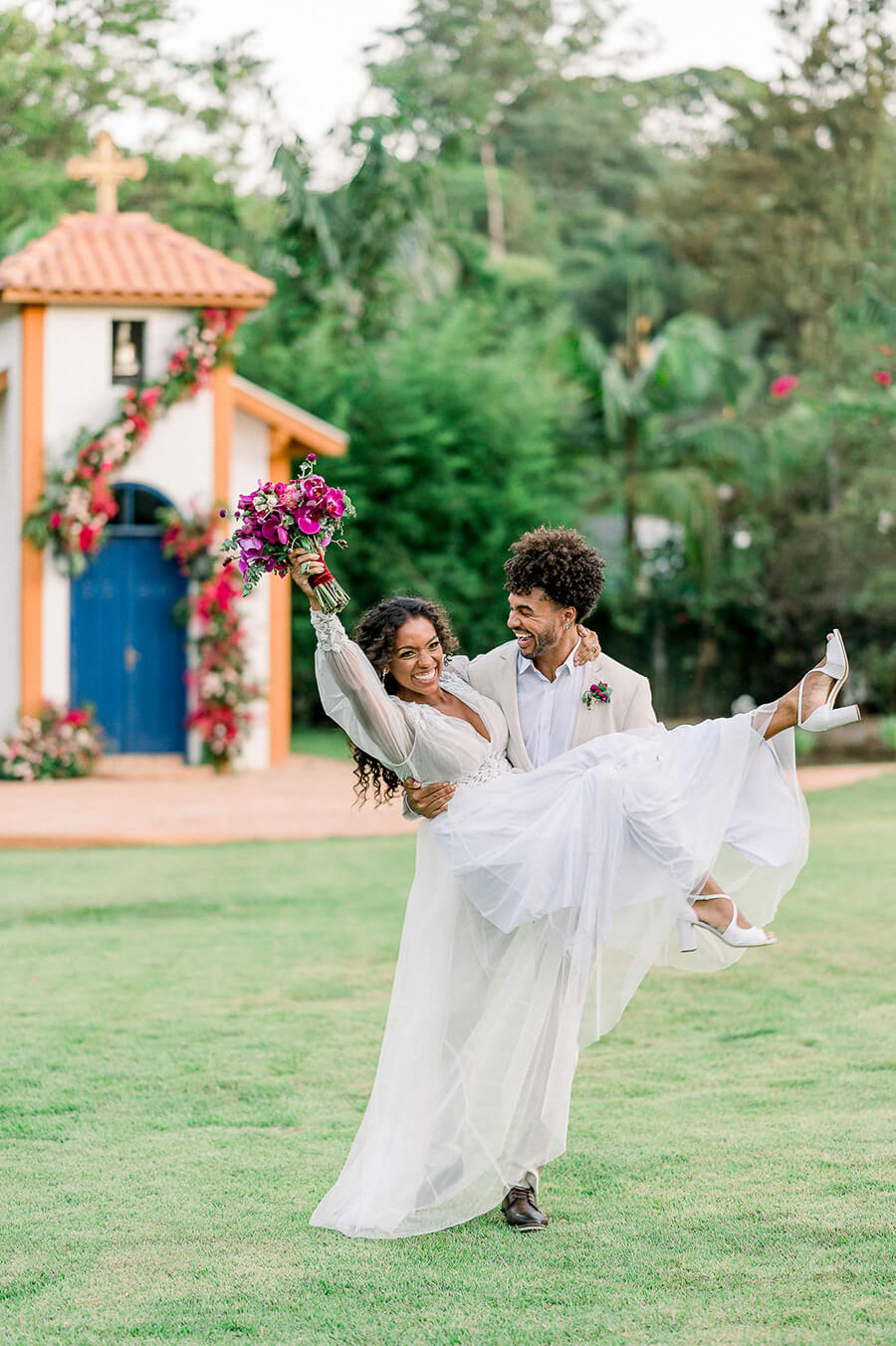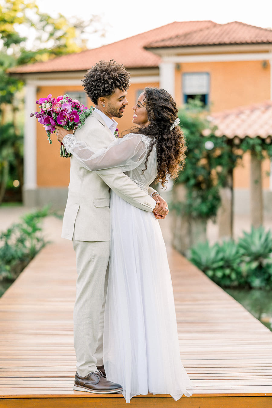 Já ela, usou um vestido fluído de mangas longas e aplicações florais, que juntamente com o penteado semipreso e o solitário com diamante de coração, trouxeram a vibe romântica que o editorial buscava. O buquê foi a cereja do bolo e arrematou o visual da noiva com um toque de Viva Magenta.