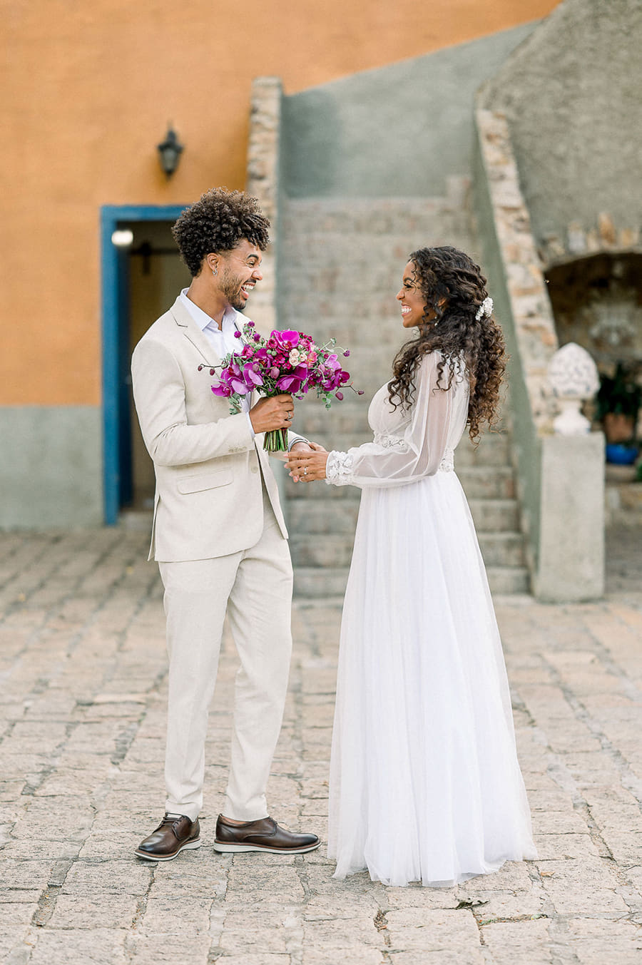 Já ela, usou um vestido fluído de mangas longas e aplicações florais, que juntamente com o penteado semipreso e o solitário com diamante de coração, trouxeram a vibe romântica que o editorial buscava. O buquê foi a cereja do bolo e arrematou o visual da noiva com um toque de Viva Magenta.