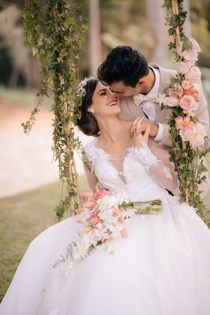 O design floral contou com um mix de flores e folhagens mais nobres, trabalhando uma paleta de cores nos tons de rosa, branco e muito verde, se explorando assim todos os espaços do jardim em perfeita harmonia. Havia o arco de flores para a troca de votos, mesa dos noivos com aéreo bem suave de orquídeas, buffet, bar e os lindos pontos instagramáveis, um balanço e o lounge com arco e muita flor, que foram os queridinhos dos noivos.