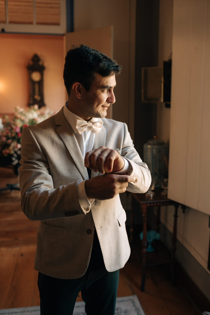 O conjunto totalmente inusitado tem colete e a calça verde oliva e o paletó num tom cru mescla. A gravata borboleta completa o look. “Finalizamos com uma boutonniere muito elegante usando as mesmas flores do buquê da noiva…simplesmente perfeito!”