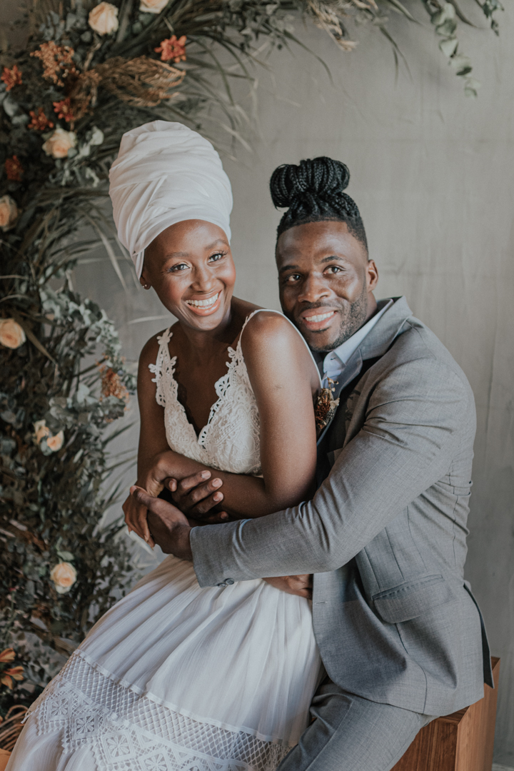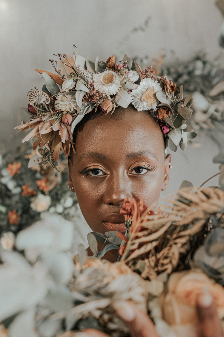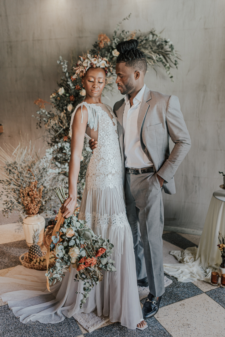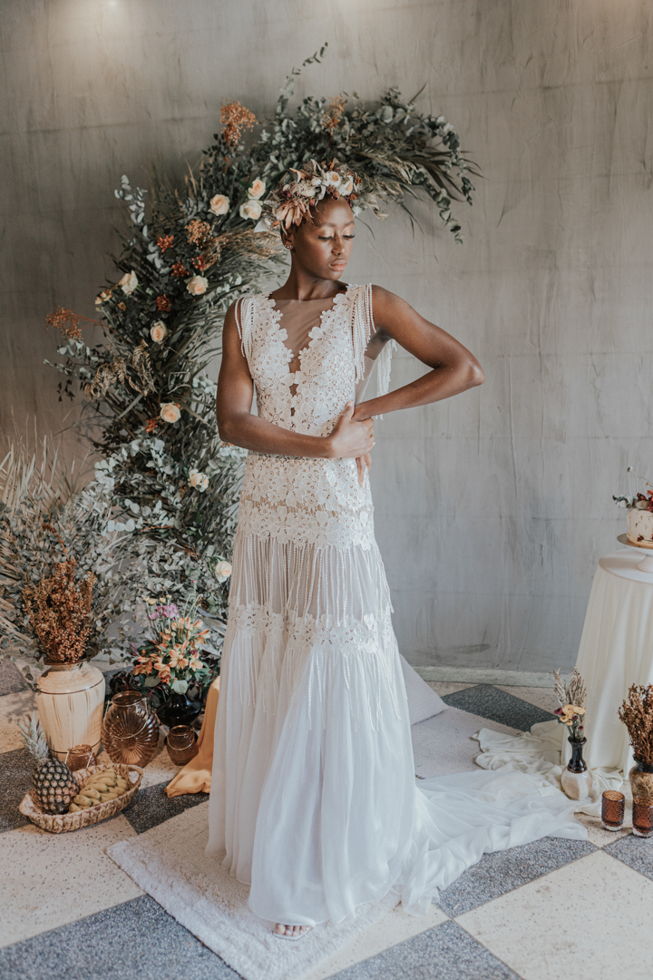O look retrata bem essa mistura do passado e presente, com vestidos fluidos e leves, com rendas, na cabeça um arranjo de flores secas coroando essa noiva!
