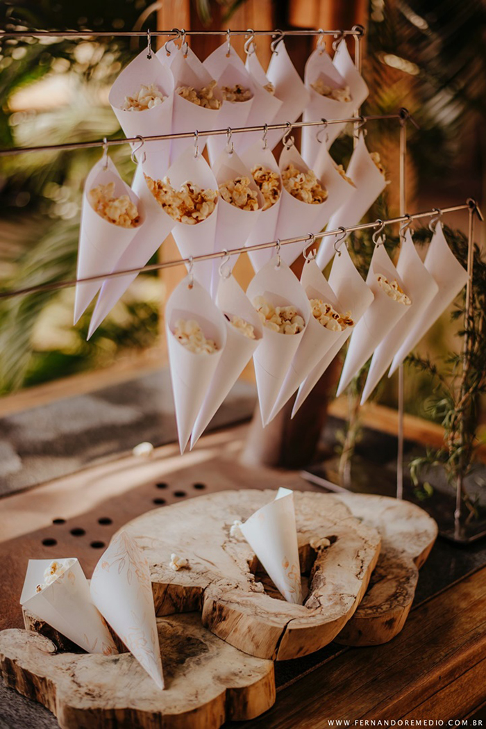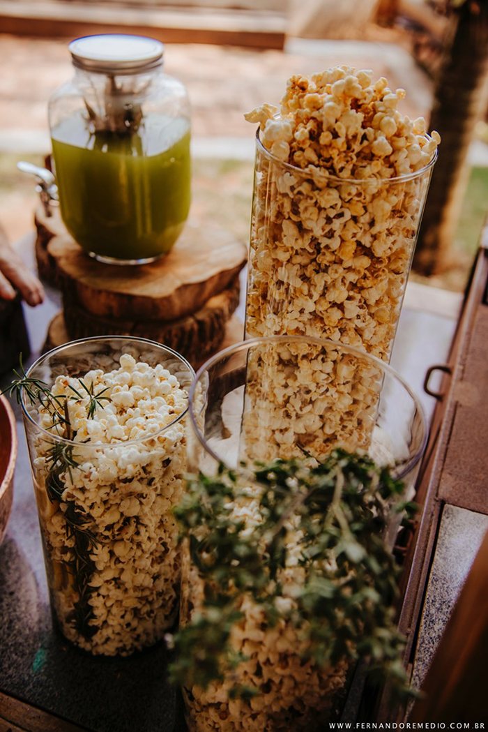 Um vez que a cerimônia estava marcada para às 10h30 da manhã, veio a proposta de um Cardápio de Brunch composto por um Welcome Drink contendo águas aromatizadas, mate gelado com frutas, suco de capim-santo com abacaxi, pink lemonade em garrafinhas e pipocas gourmet servidas em cones personalizados de papel.