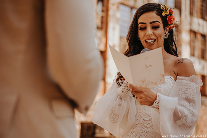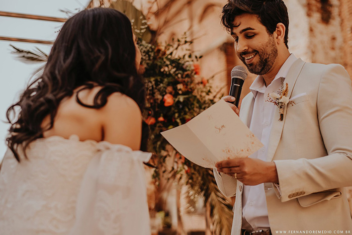 “Buscamos incorporar um pouco do conceito de sustentabilidade em nosso editorial para vários itens, como papelaria e decoração.” No convite, o pequeno toque de sustentabilidade foi dado no envelope (feito à mão) produzido em papel artesanal, que tem na sua composição fibras naturais e pequenas cascas de cebola. Além do convite, o roteiro da cerimônia para a celebrante, os votos dos noivos e o menu foram produzidos para este momento seguindo a mesma identidade visual.
