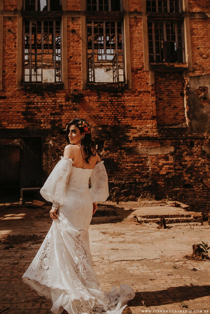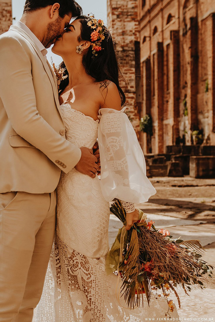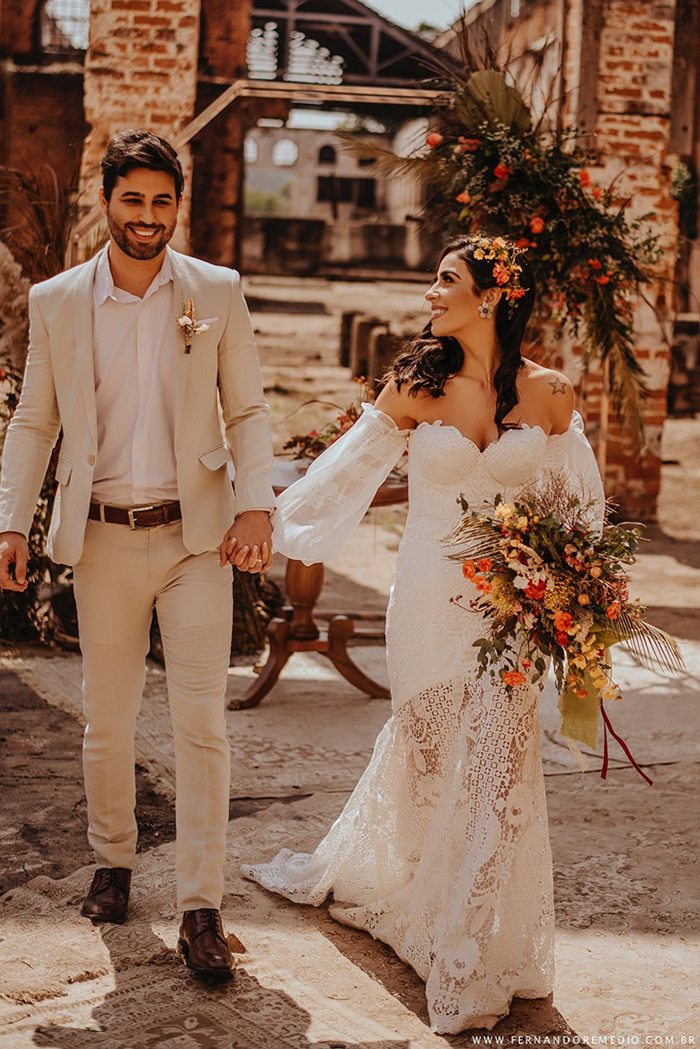 “Optamos pelo boho por ser uma tendência que vem num crescimento há algum tempo e por sermos apaixonados por este estilo.” Encontraram nas ruínas de uma antiga usina de Piracicaba a possibilidade de apresentarem novas ideias para um elopement wedding, mas algo que o mercado veria como possível, real.