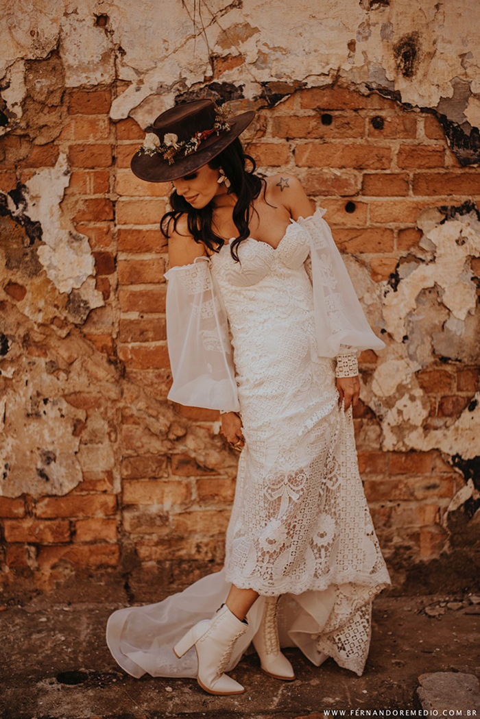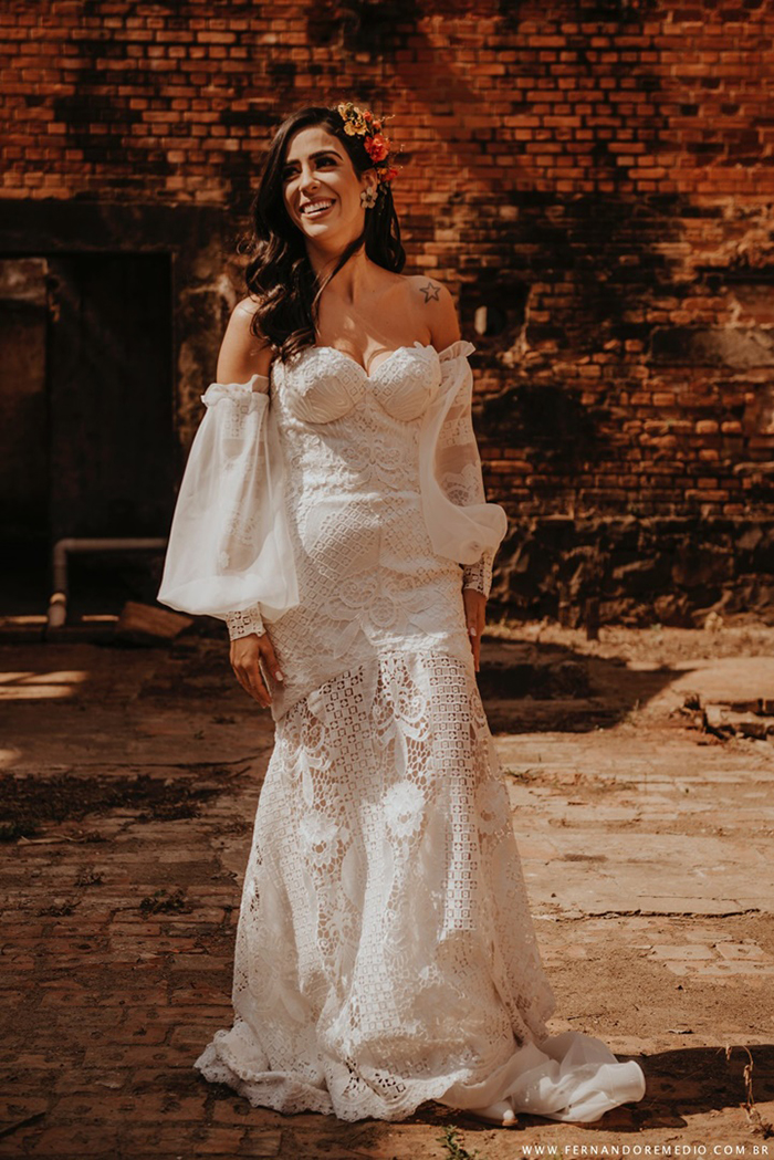 Desenvolvido sob medida para a Júlia no estilo Boho, tendo uma mescla de renda nacional e importada, se apresenta como um vestido versátil e super tendência com mangas removíveis, podendo ser utilizado de 03 maneiras: sem manga, com manga curta e uma outra opção com manga comprida bufante, mantendo o ombro de fora.