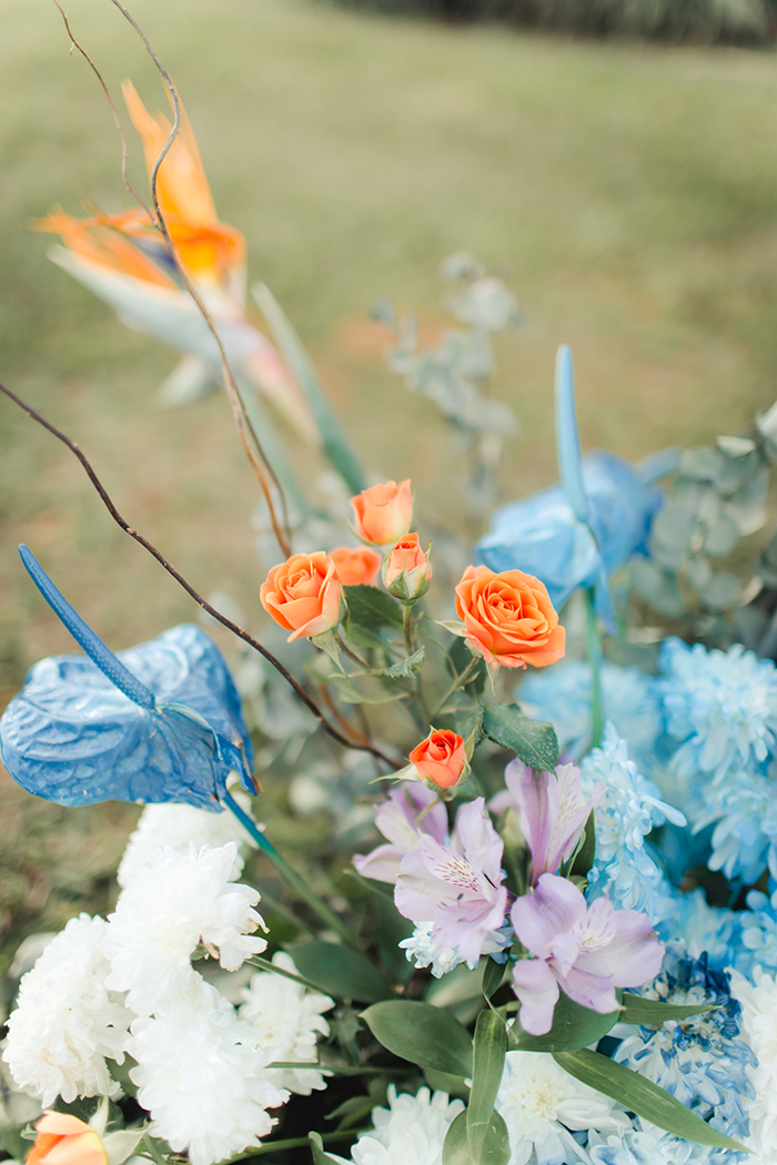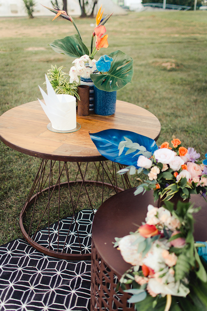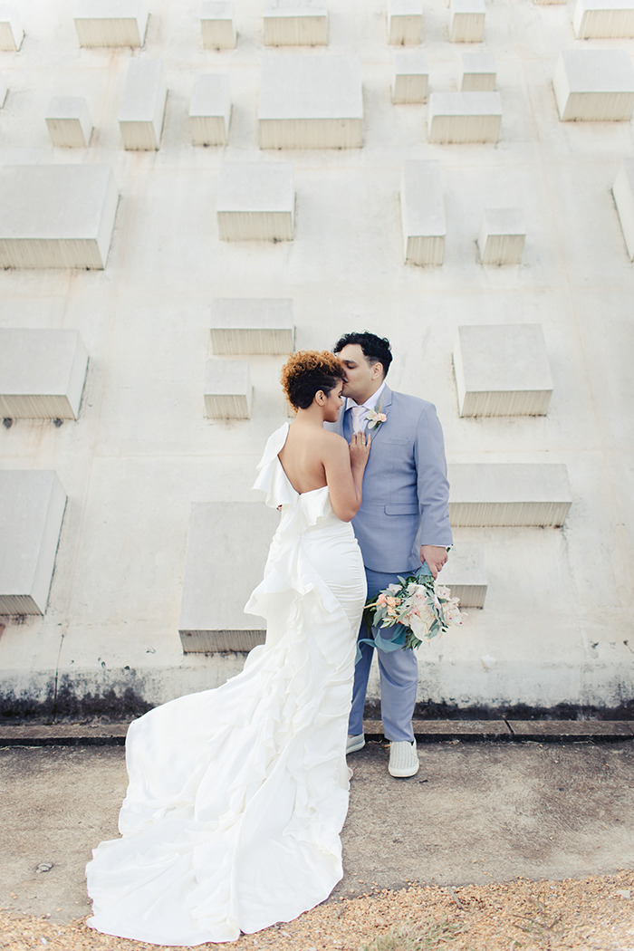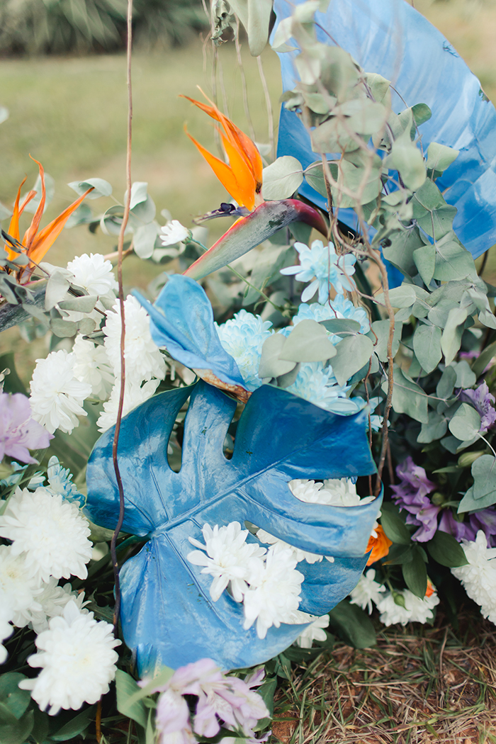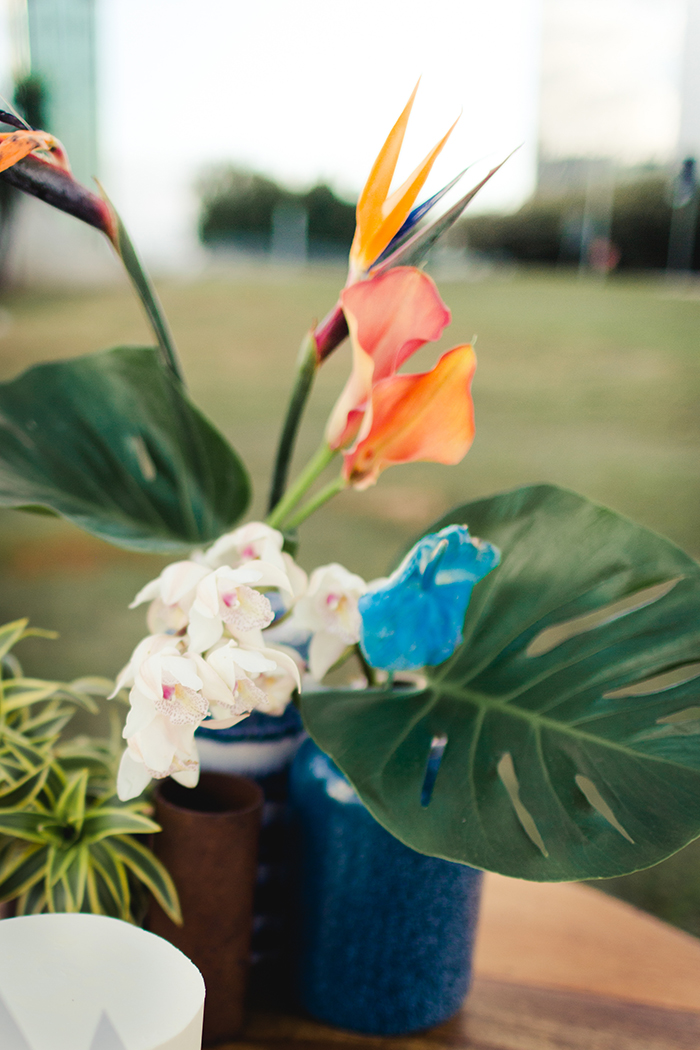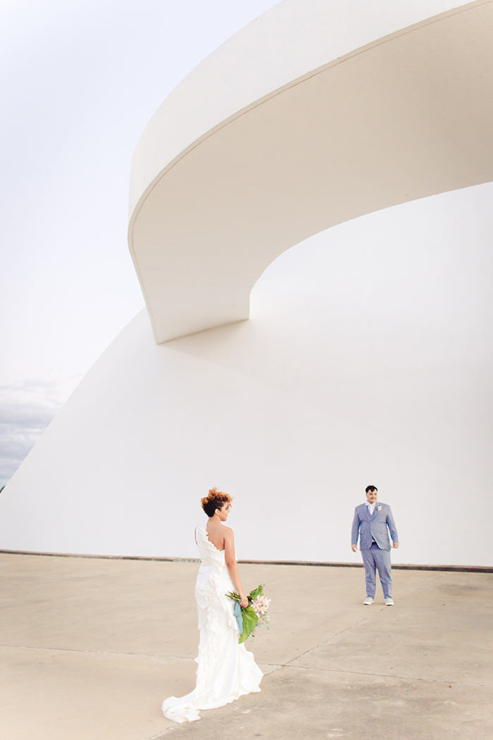 Toda a decoração produzida pela Nós por Dois, que incluiu folhagens tingidas (grande tendência nos casamentos, clique aqui para ver) e modernos móveis da Rose Bueno, seguiu essa paleta de cores, além do traje do noivo em azul claro e o lindo vestido da noiva by Redress, que foi escolhido por suas formas que se ligavam aos monumentos da cidade e também por remeter a uma noiva que é ligada em moda, e gosta de peças únicas e modernas.