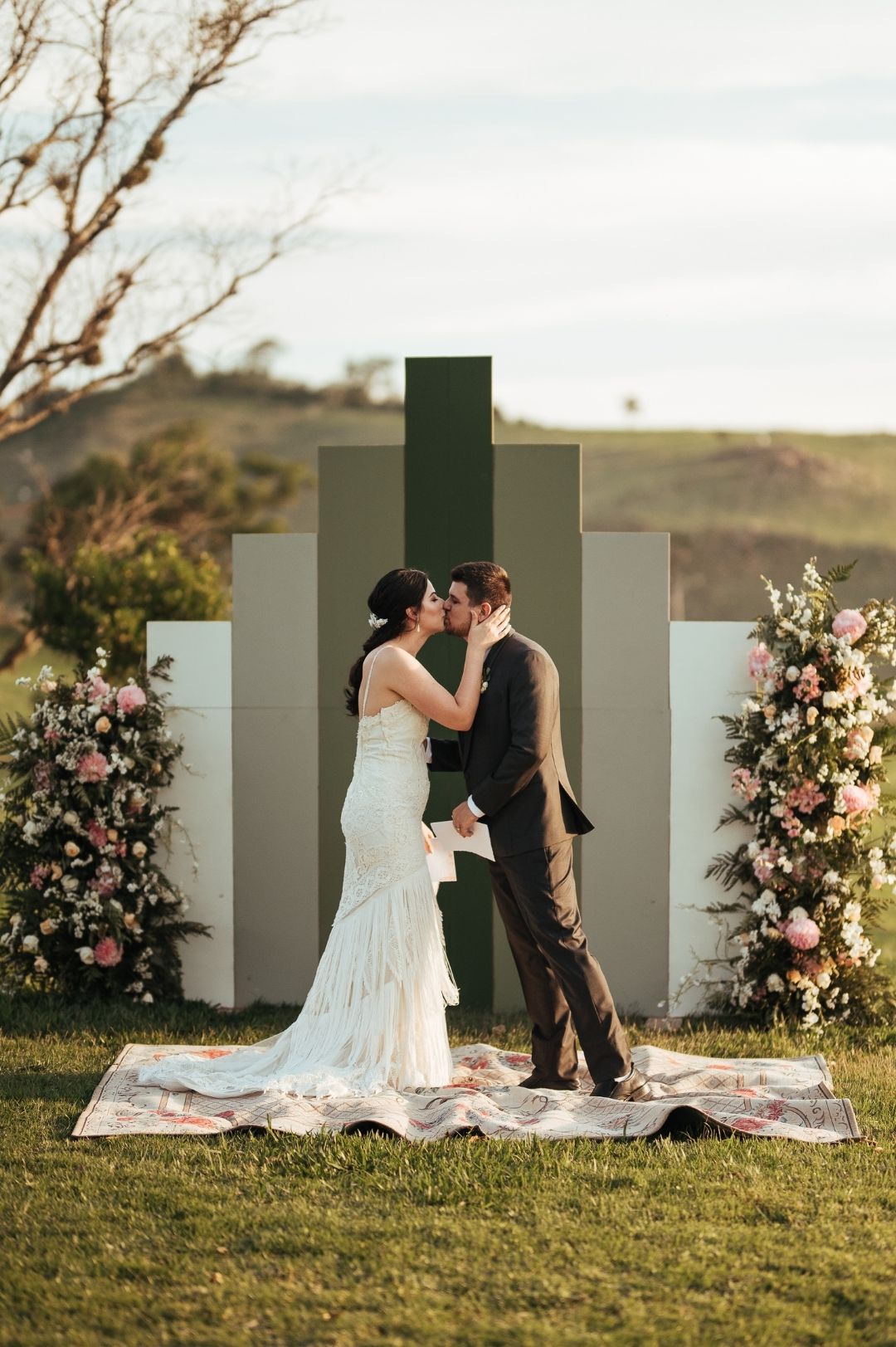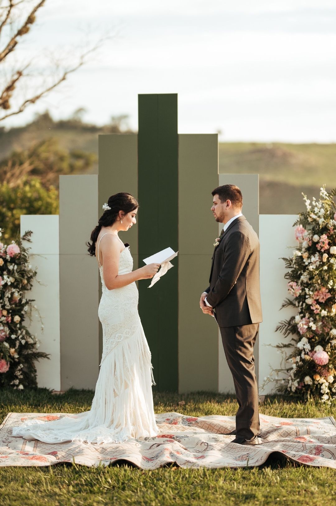 A Veronica é romântica, então o vestido de noiva da Casamarela com franjas trouxesse a leveza de um casamento diurno na fazenda.