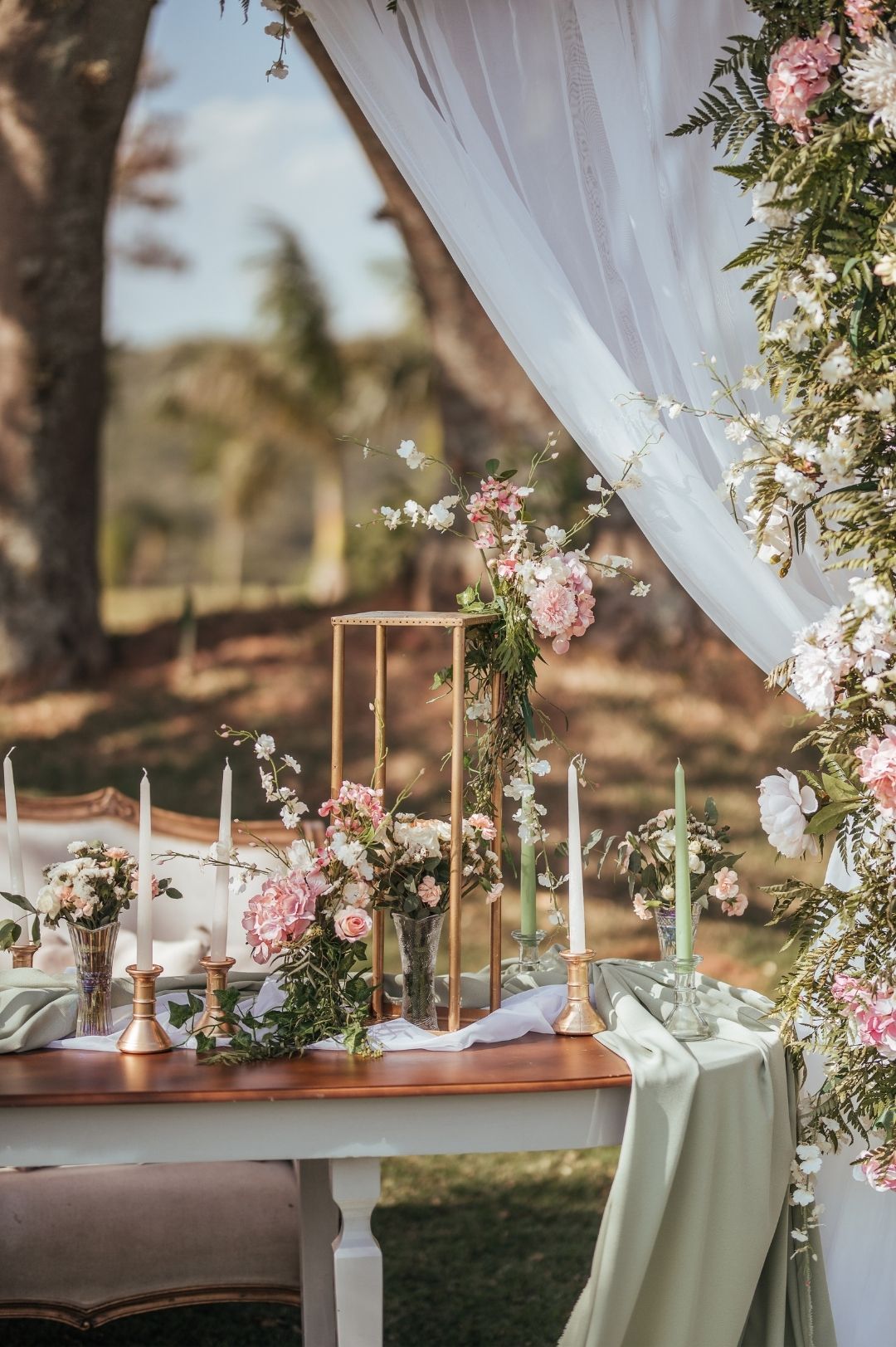 O projeto de decoração teve quatro cantinhos: backdrop para fotos dos noivos, mesa do casal/ família, altar da cerimônia e mesa única do bolo. Tudo com uma vibe romântica com uma paleta de cores em tons modernos que ficou espetacular, combinou perfeitamente a Fazenda. Amamos cada um deles!