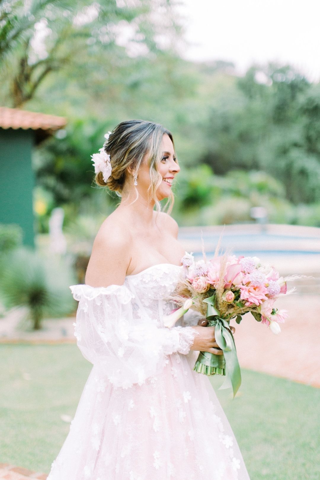 O vestido da Laís foi feito com o intuito de transmitir leveza, delicadeza e modernidade. Com sua modelagem e caimento fluído, havia uma sensação de leveza e jovialidade. Suas flores em 3D foram aplicadas a mão, e camadas sobrepostas, incluindo nele um crepe toque de seda e renda chantilly. O corpo estruturado, espartilhado e com suas mangas bufantes removíveis, deixaram o vestido ainda mais incrível e único.