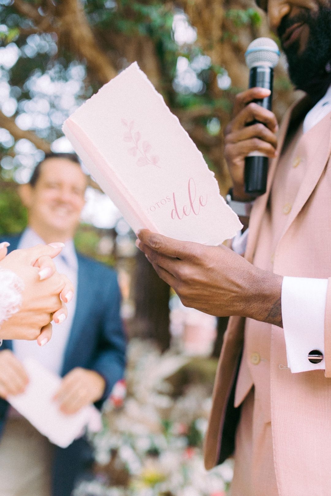 A Laís e o Célio são um casal real que toparam participar do editorial, organizado com todo carinho pela Augusta Cerimonial, e foram surpreendidos por uma cerimônia cheia de significado pelo celebrante Maurício da Eu Caso Vocês que disse, inclusive, que eles estavam casados pela vida desde que se conheceram.