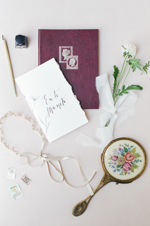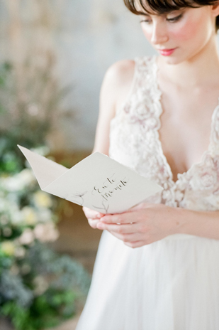 A noiva tem um cartão de votos, com caligrafia escrita à mão e o papel escolhido foi de algodão natural, com bordas ásperas, para torná-lo ainda mais romântico.