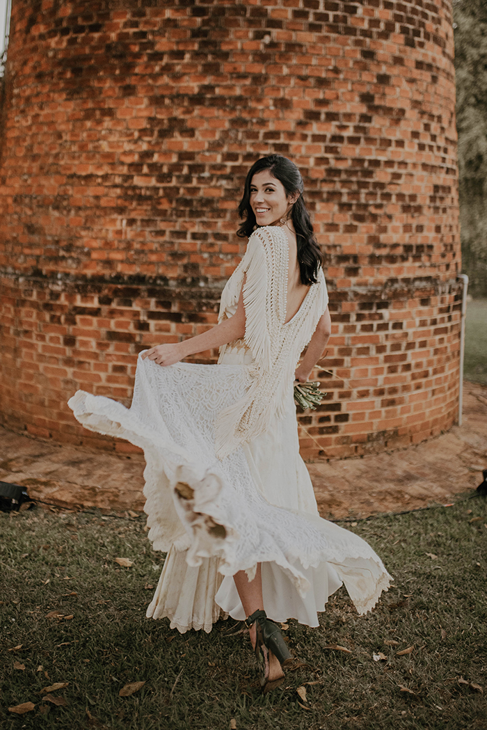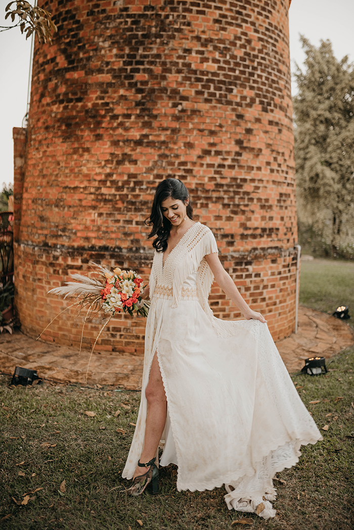 Para o vestido de noiva, a ideia era ter algo leve que combinasse com o estilo boho e folk que o