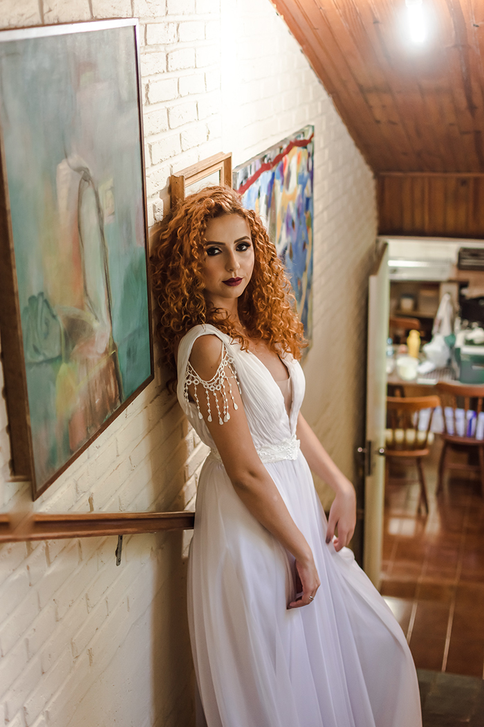 Depois de conhecer o Vale dos Ângicos, a chácara da florista, as inspirações se multiplicaram e o editorial foi tomando forma. A casinha com ar antigo e paredinha de tijolos, o corredor com obras de arte, as janelinhas de vidro decorado, um carramanchão e aquele jardim com uma mata de tirar o fôlego, que coisa mais linda! O nome tinha que ser inspirado naquele lugar que mais parece um conto de fadas.”