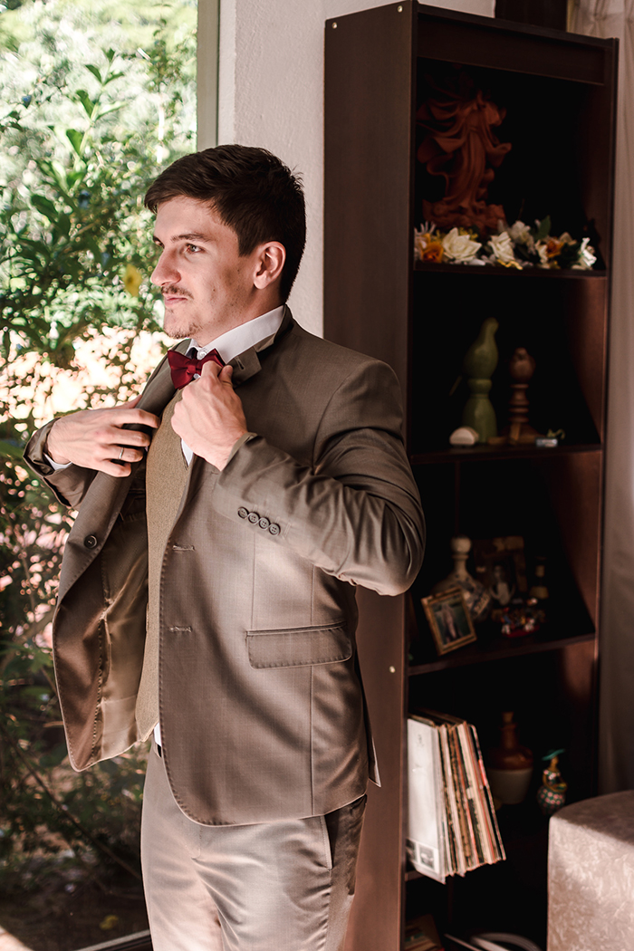 O vestido de noiva e o terno do noivo não poderiam combinar mais com a proposta intimista com toques boho! Ele de terno e colete em tom de taupe e ela com os cachos livres! Gente, estamos sem ar esse cabelo incrível!!!!