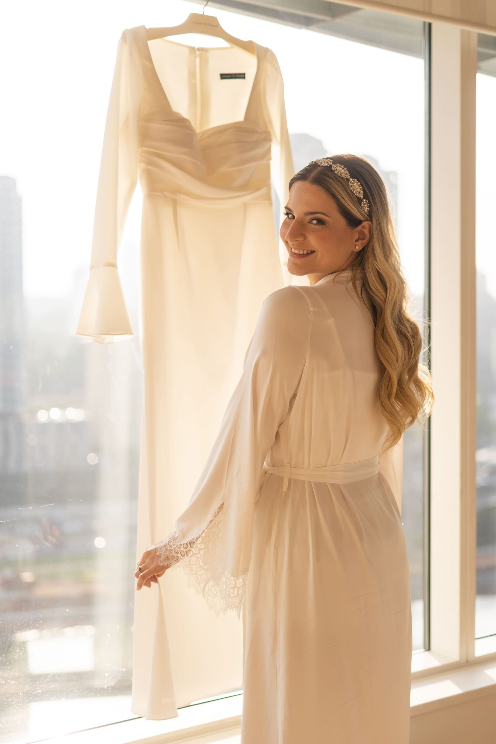 “Eu desenhei o meu vestido com elementos que gosto e uso muito, como manga longa e sino, liso sem renda e aplicações, e mais justo. A cauda era uma saia removível, para a Igreja. Durante uma das provas do vestido, surpreendi minha mãe, pois ele tem um cintinho com um laço igual ao que ela usou em seu casamento. Ela ficou super emocionada e quando viu, gritou ‘meu laço!!! Quando você pegou?’