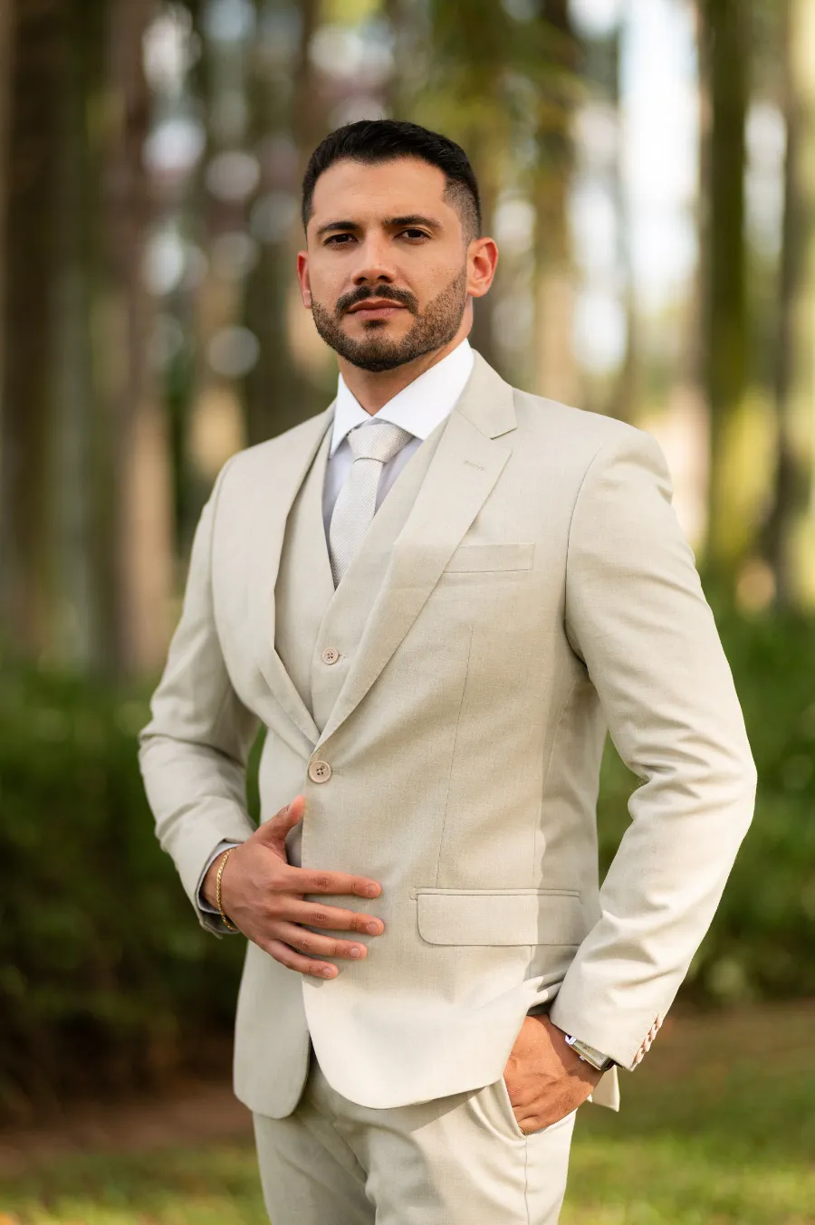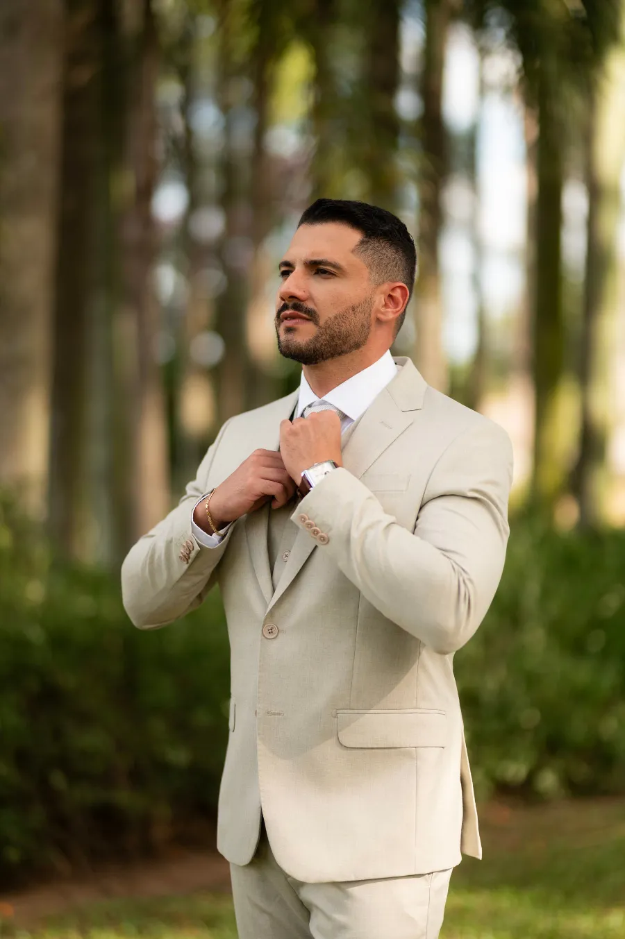 O look do noivo seguiu o estilo clássico com um traje de três peças, mas na cor cinza. Aliás, essa também foi a cor escolhida para os padrinhos, mas em um tom mais escuro.