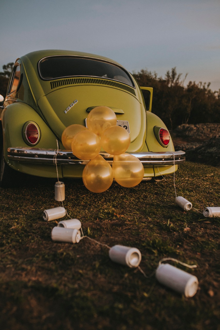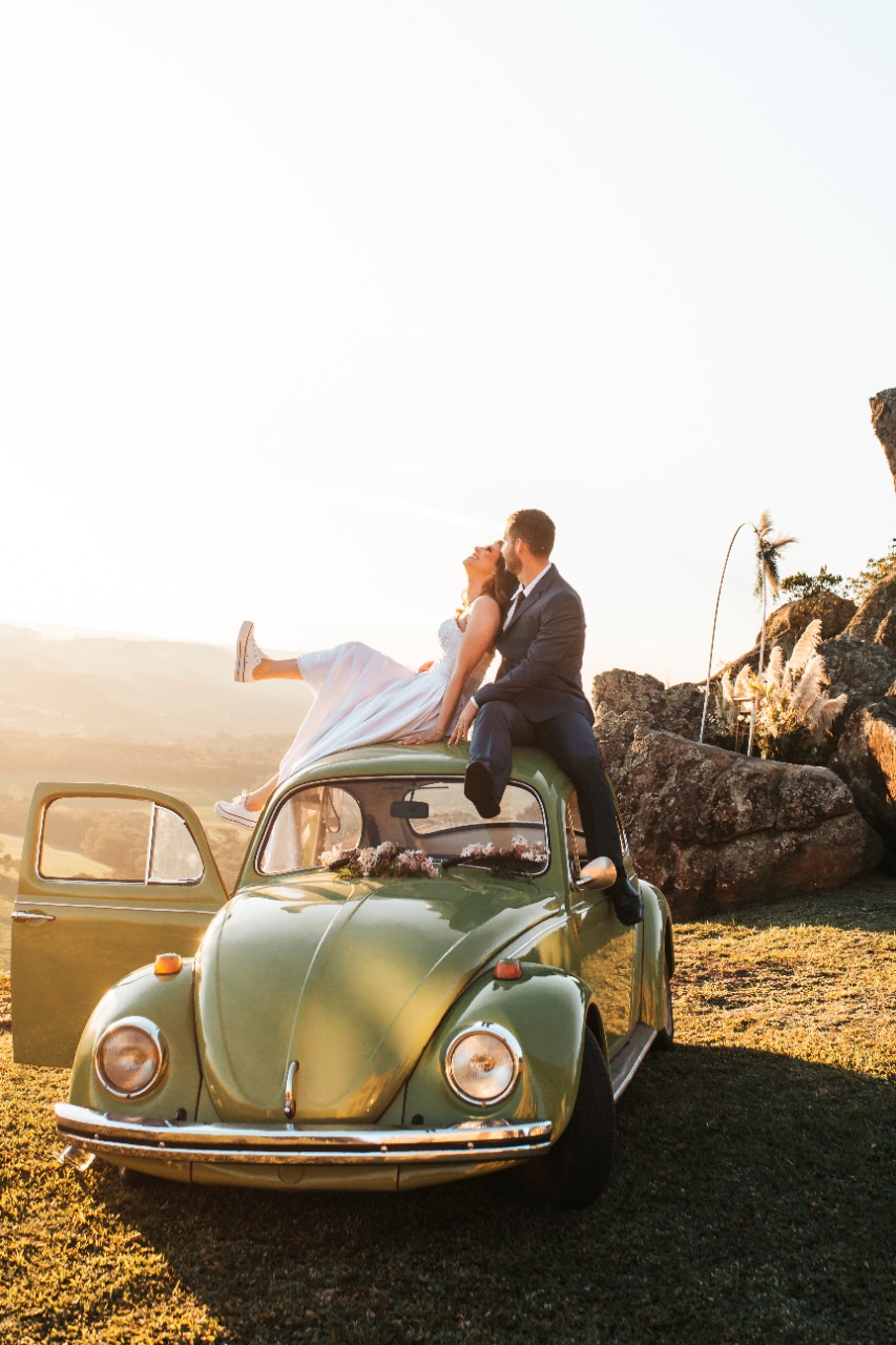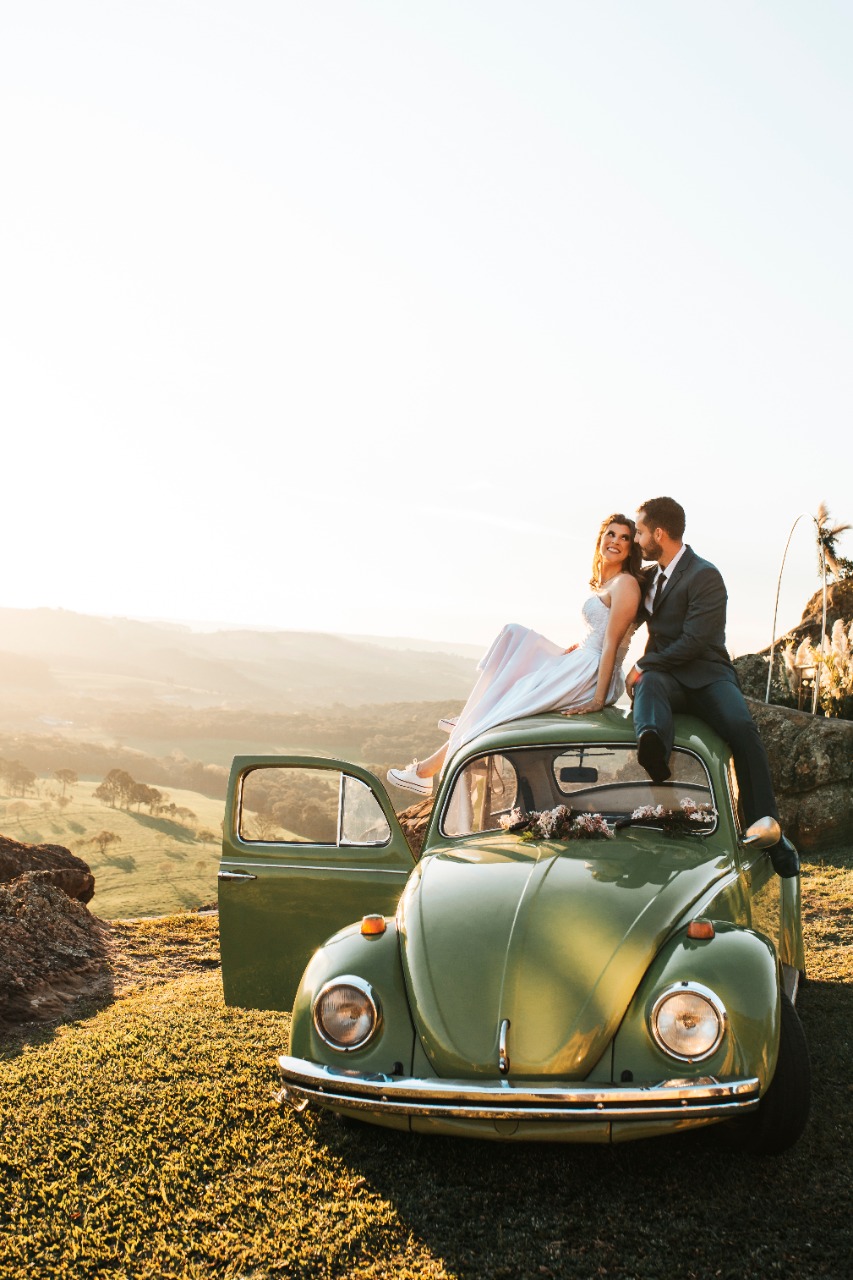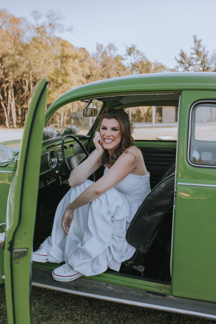 A decoração seguiu o estilo rústico com detalhes que ficamos apaixonadas, como os tons pastel no vestido das madrinhas, o buquê em folhagens secas, a noiva de tênis e chegada num fusca super charmoso!