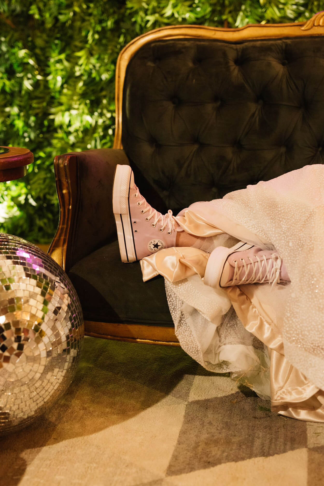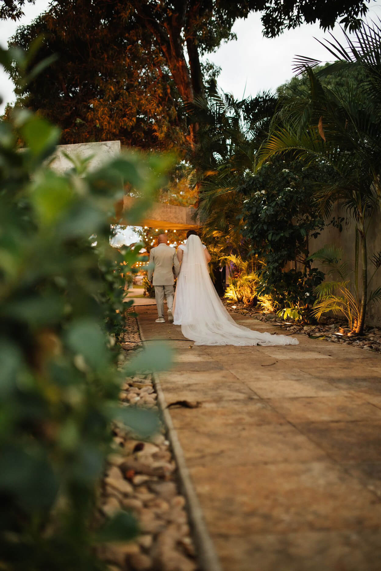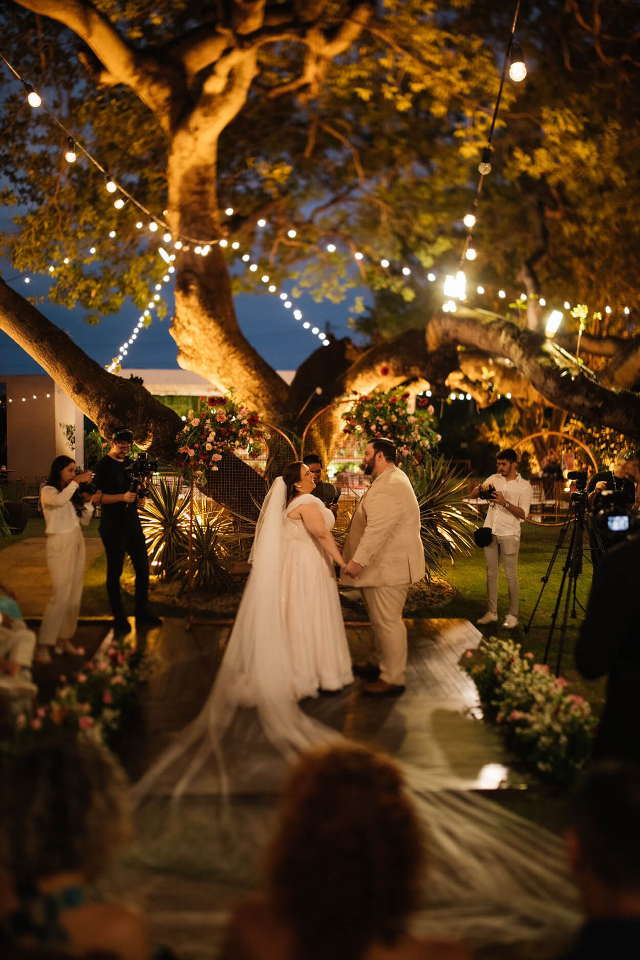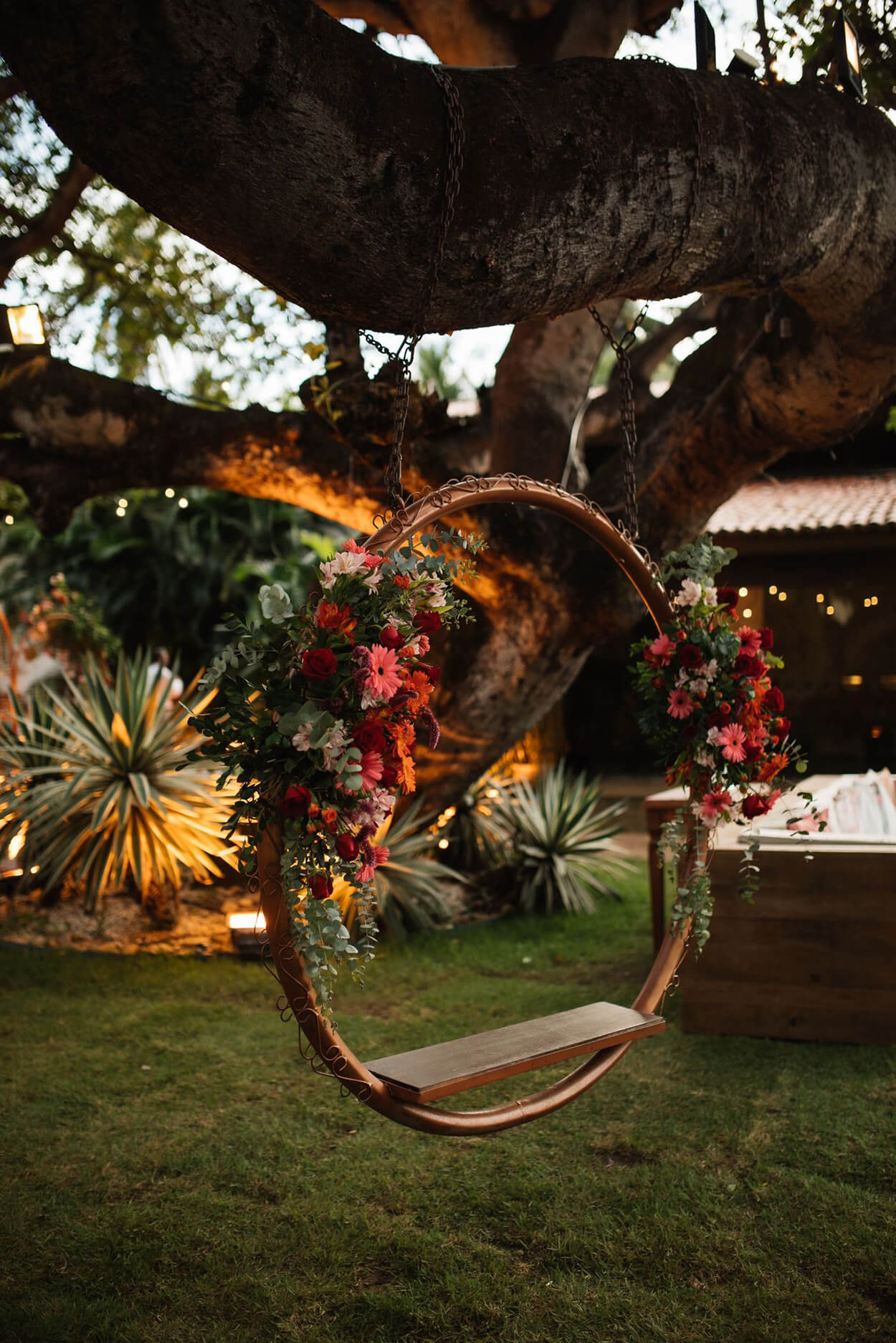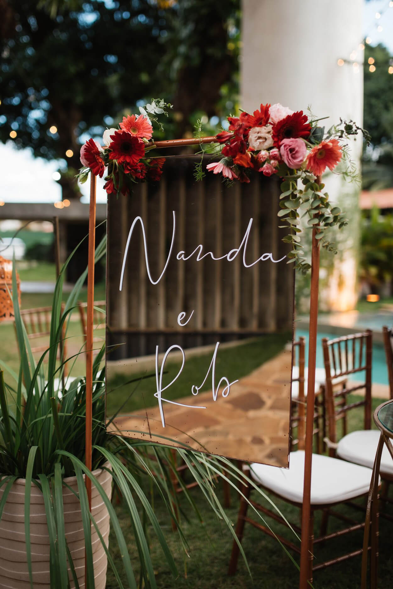 Mesmo pertinho da praia, a noiva escolheu um belo jardim urbano para a cerimônia. Além disso, ela também optou por uma decoração romântica, com cores quentes e repleta de flores. Olha só que charme esses pequenos globos espelhados!
