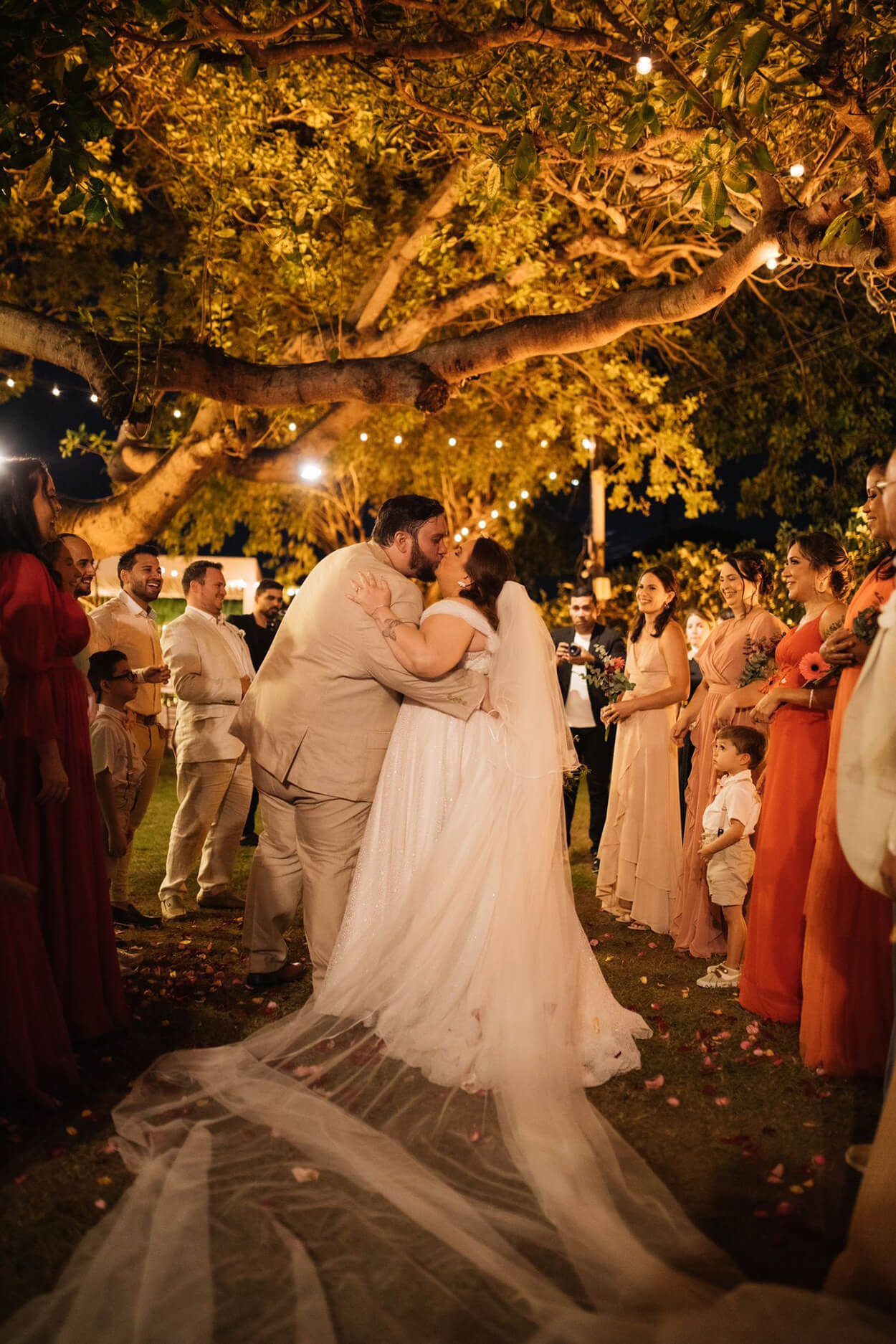 Lembra que falamos da paleta com cores quentes? Então, elas voltam à cena com as madrinhas. E a combinação ficou ainda mais interessante visualmente por formar esse degradê. Sem contar que os mini buquês em braçada elevaram a produção, né?