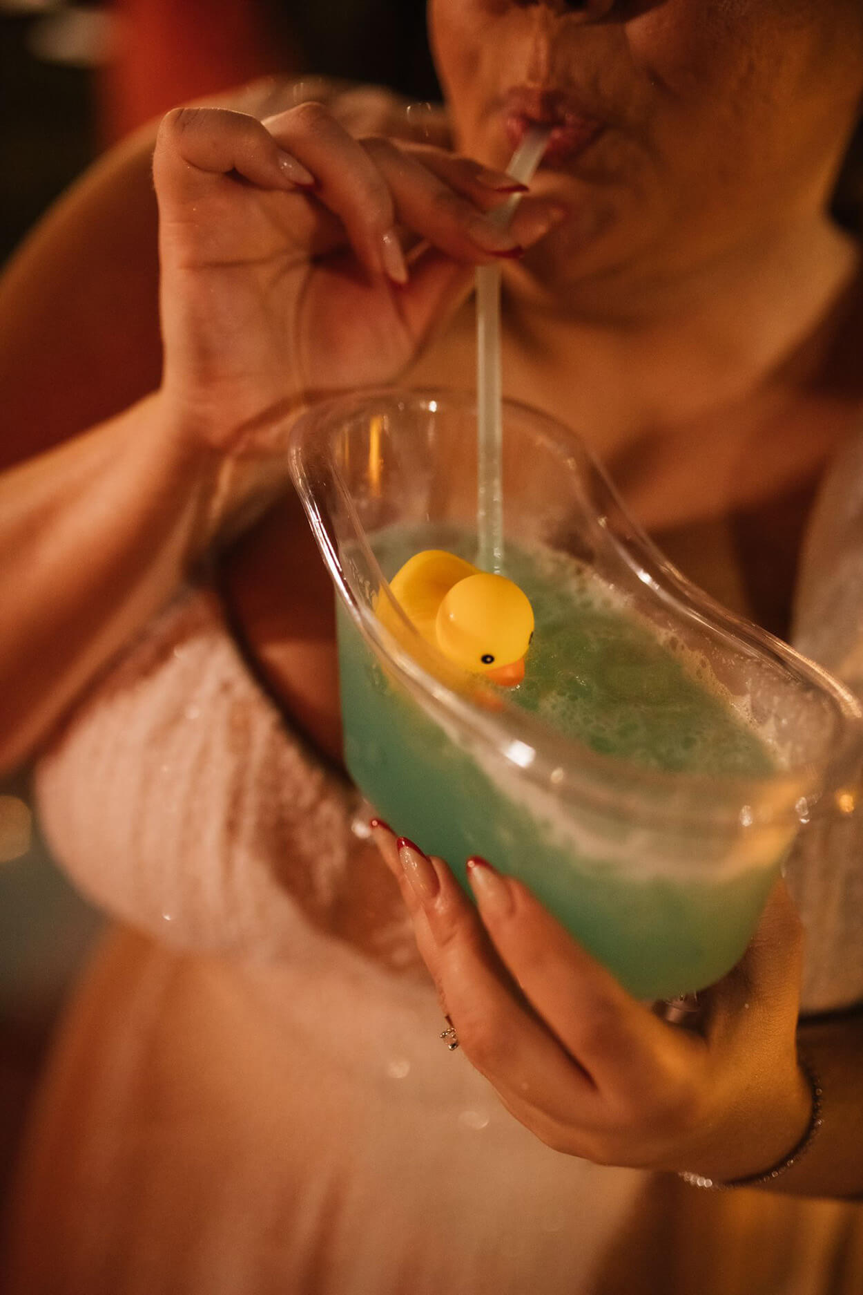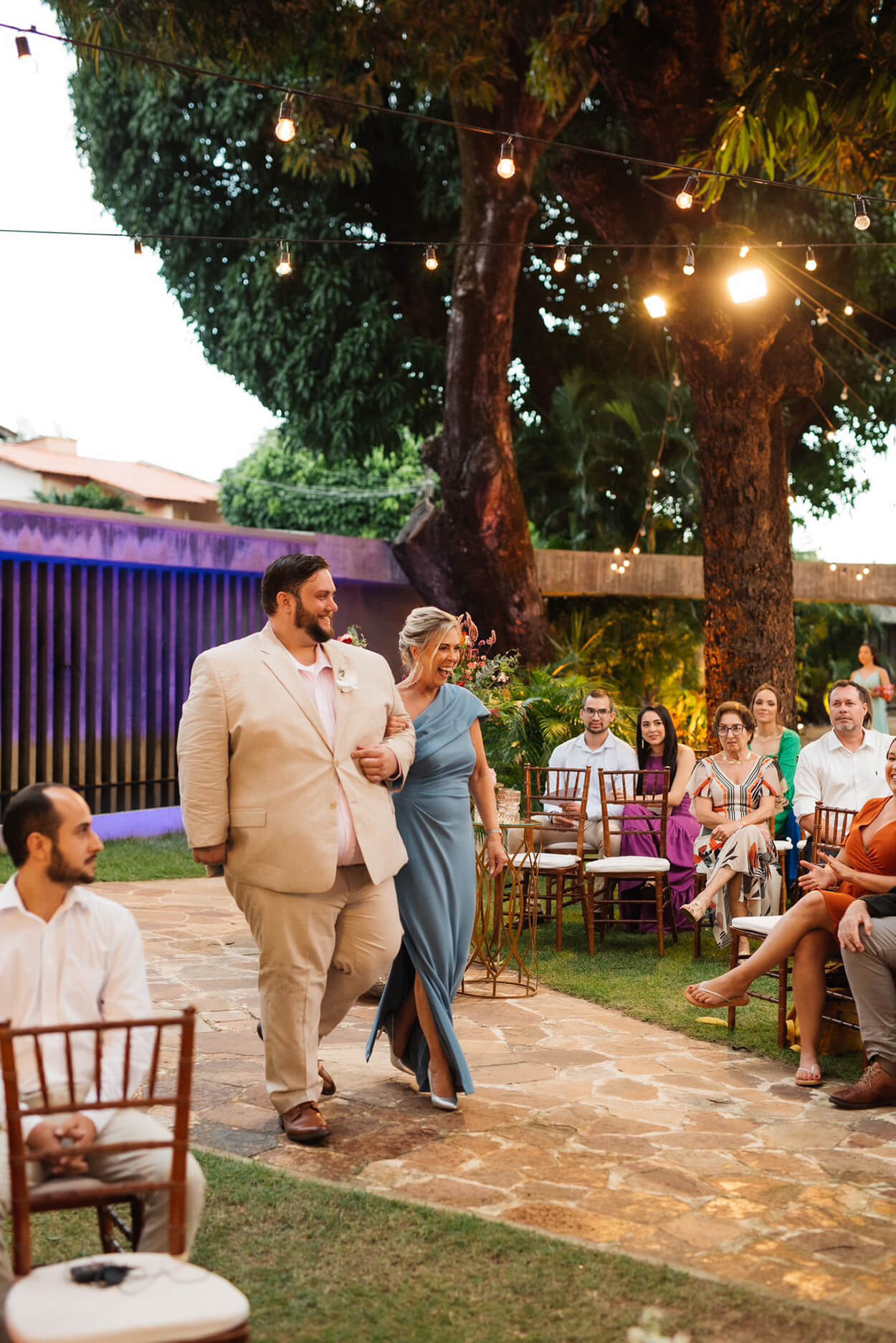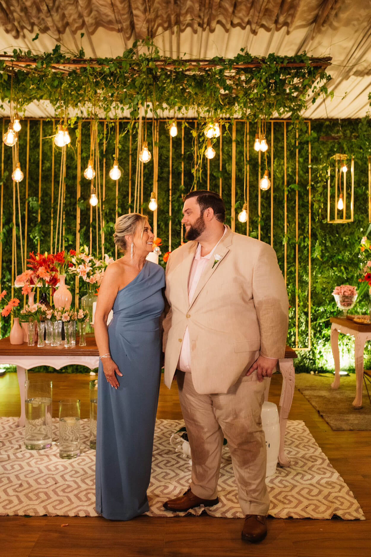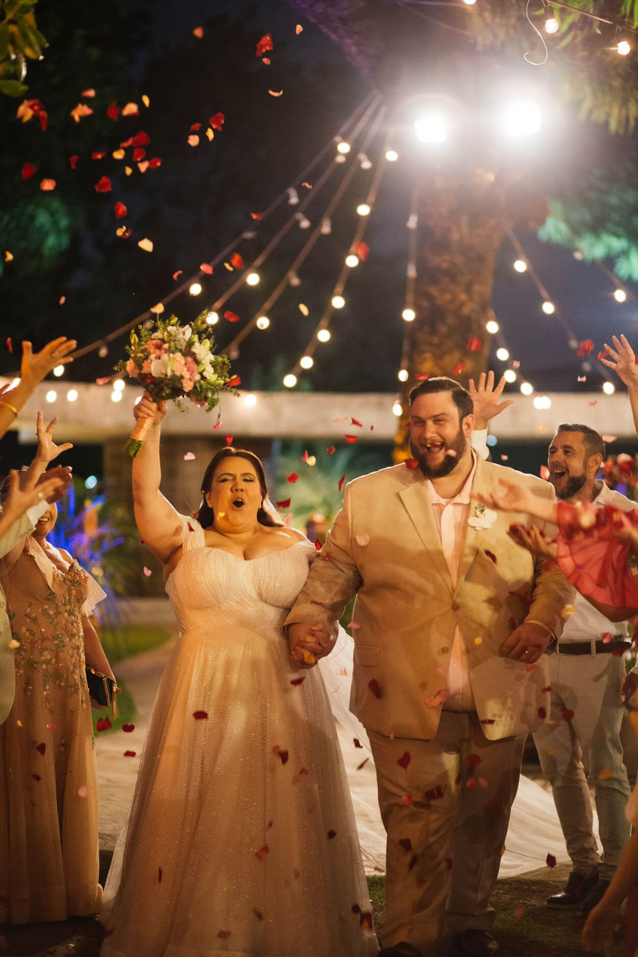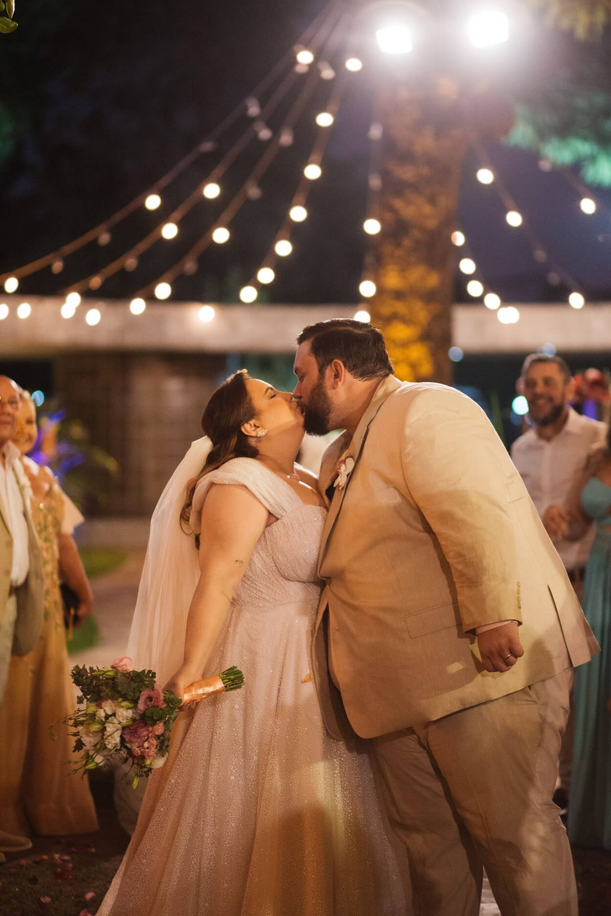 Como a celebração começaria quase ao pôr do sol, a Fe escolheu um vestido que combinava tanto com o clima diurno quanto noturno. Com a diferença que à noite, os brilhos do modelo ganharam mais destaque. Ela também priorizou um corte que desse mais sustentação aos seios para ficar confortável durante toda a festa.