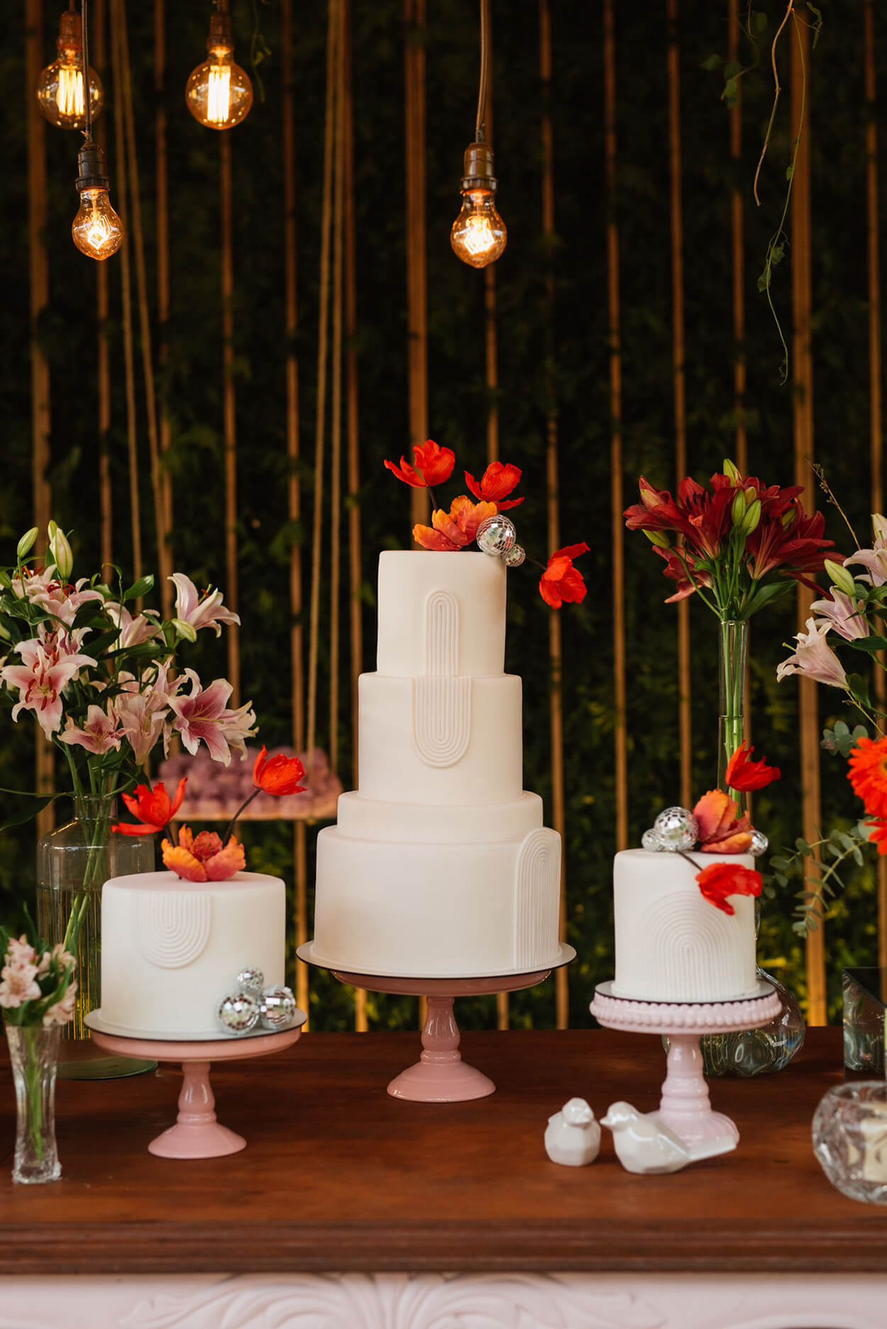 mesa com vasos de flores rosas e bandeja com doces de casamentoEles planejaram todo o casamento nos EUA e o resultado foi esse!