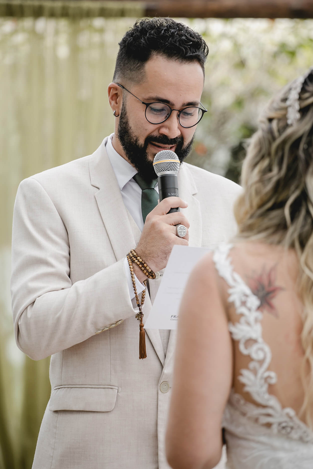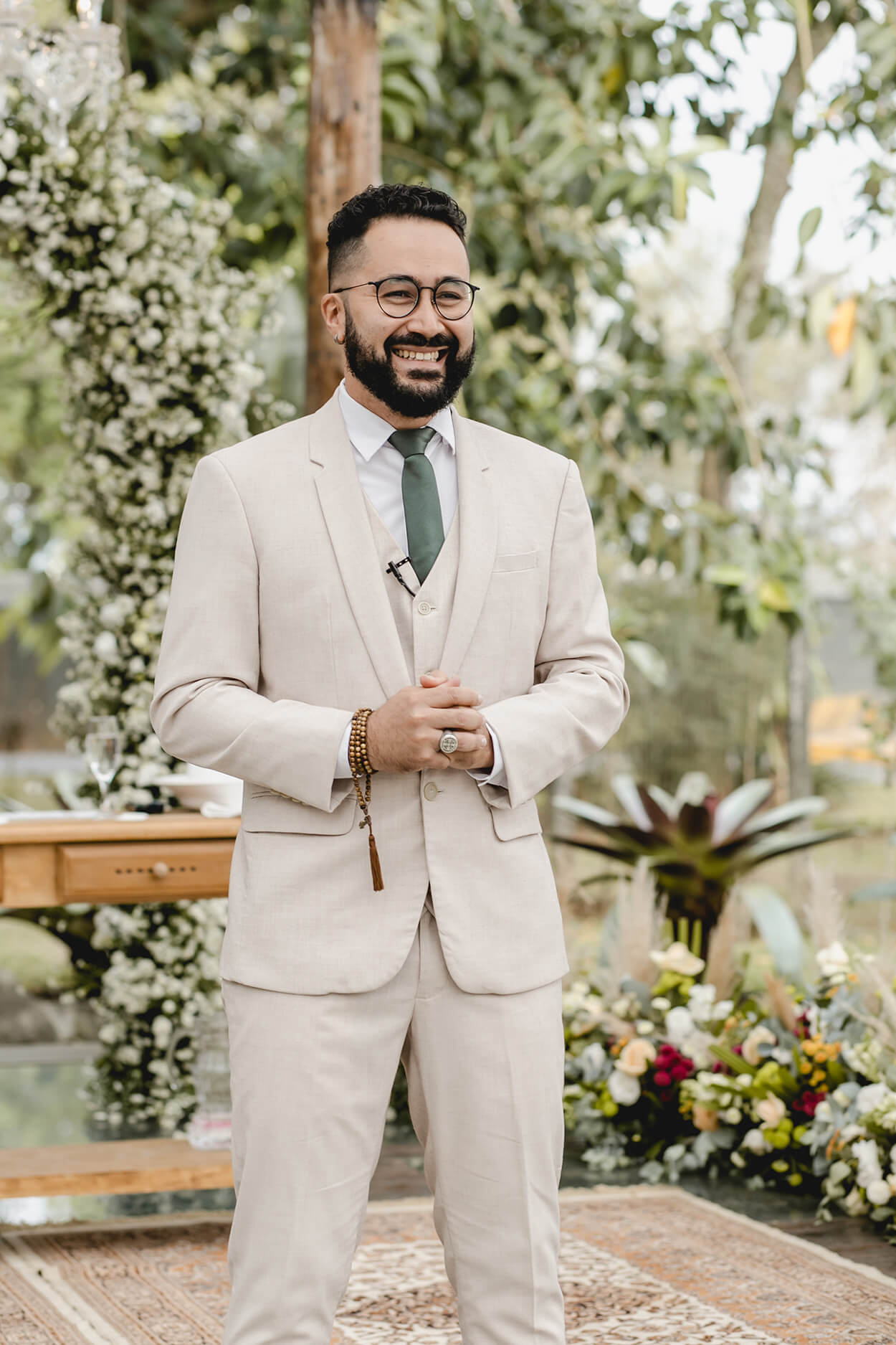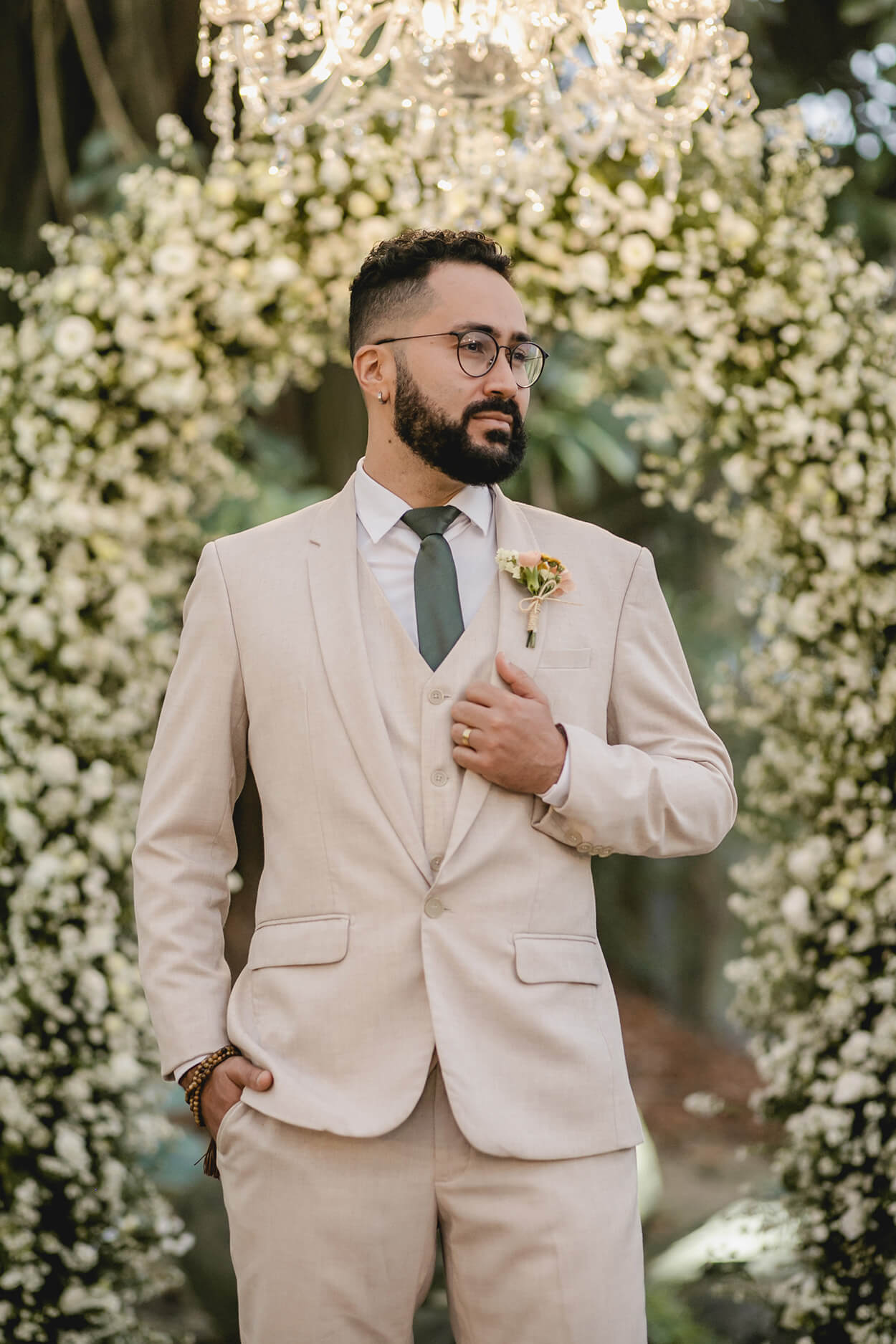 Antes de tudo, precisamos comentar sobre o look do noivo. O terno com três peças, que é mais formal, ganha ares de modernidade com o seu tom bege e um frescor com a gravata na cor sage green.