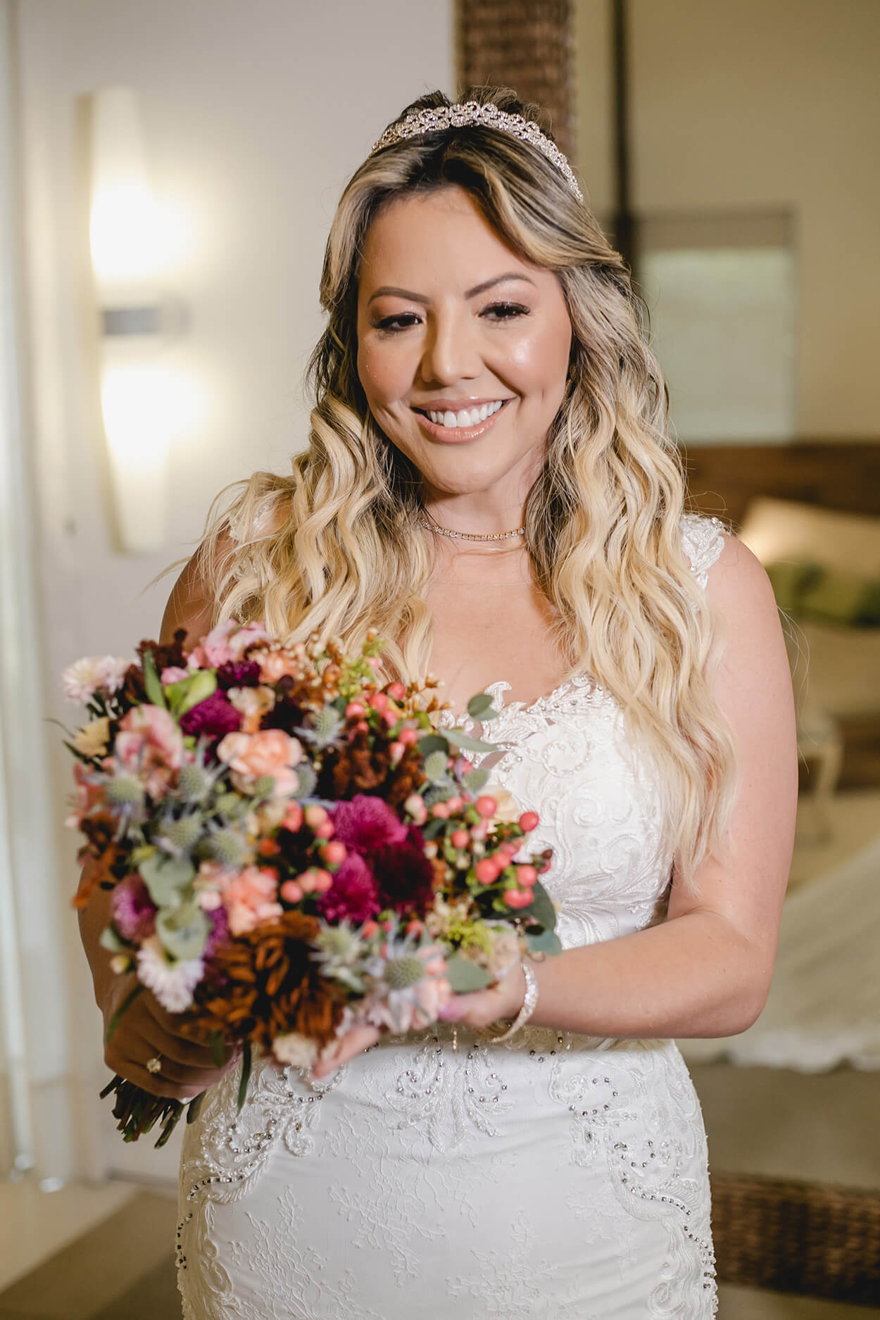 Do outro lado, temos a noiva com um vestido sereia, cheio de detalhes em bordado e um véu bem marcante.