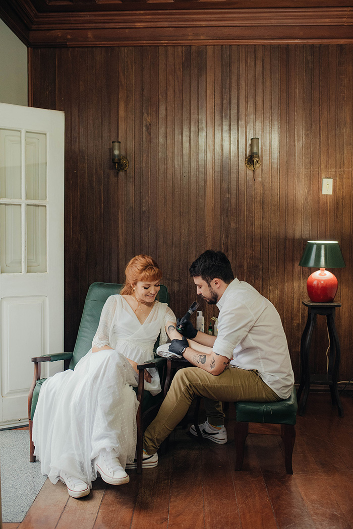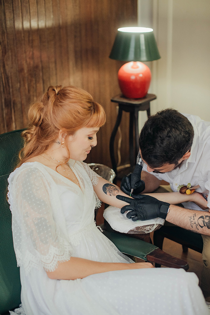 E nesse clima festivo e de amor, o Fabio que é tatuador aproveitou para fazer uma tatuagem na Raissa, depois da troca de votos! UAU!