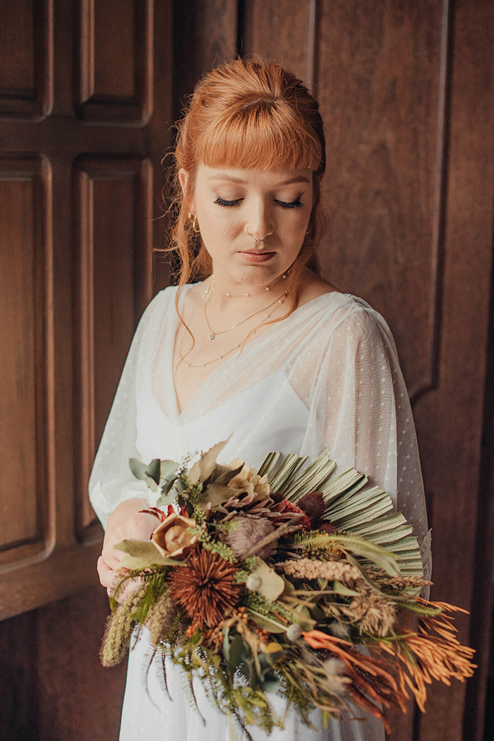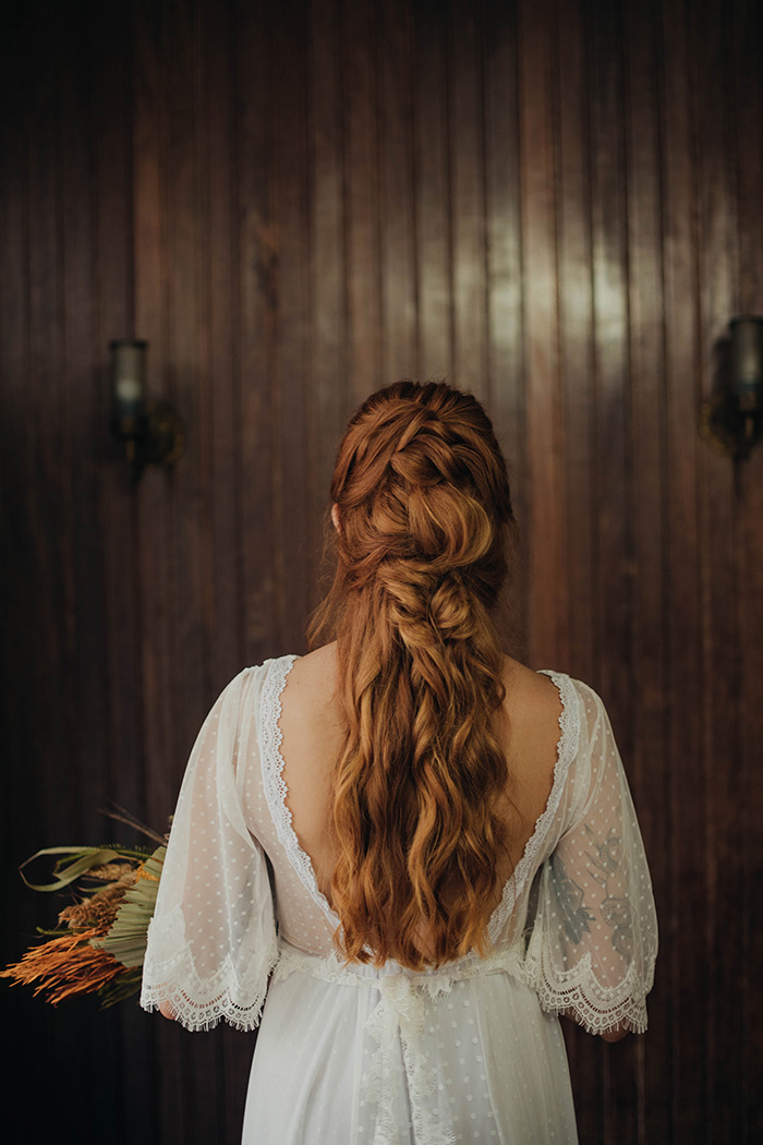“Nessa ideia de ter uma cerimônia intimista buscamos participar de tudo da maneira mais próxima possível. Então, tudo que pude eu mesma fiz. Eu busquei referências e desenhei meu vestido, fiz a encadernação do caderno de votos, o cadarço, fiz as fitinhas na barra do vestido”.