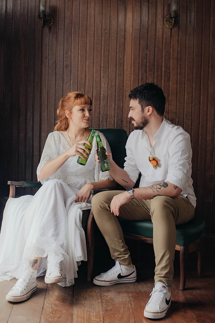 E foi nesse clima de elopement wedding que brindaram e com a bebida que mais amam: cerveja! A Raissa comenta que: “Talvez tenha sido mais difícil escolher com qual cerveja brindar do que a paleta de cores do casamento!”.