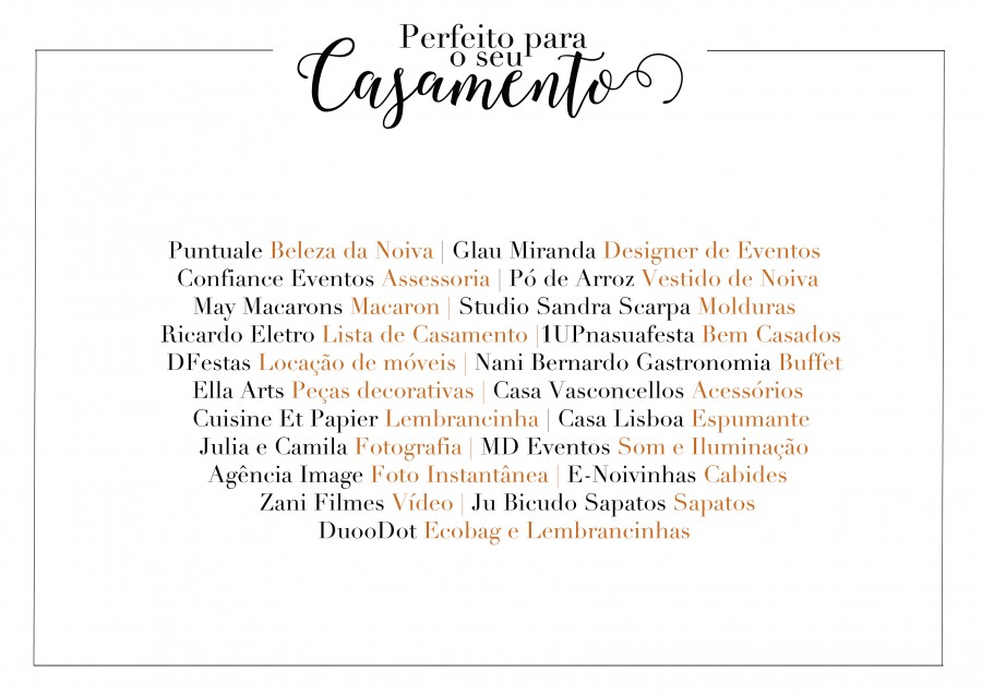 Puntuale l Folhetim l Pó de Arroz l 1UP na sua festa l Glau Miranda l Dfestas l MD Eventos l Confiance Eventos l Cuisine Et Papier l May Macarons l Casa Vasconcellos l Ju Bicudo l Nani Bernardo Gastronomia l Duoodot l Agencia Image l Ricardo Eletro l Julia e Camila l Zani Filmes l E-Noivinhas l Ella Arts l Studio Sandra Scarpa l Casa Lisboa